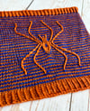 The Arachnid Cowl features a large spider motif, the spider is created with small cables and slipped twisted stitches, only one colour of yarn is used on every round.