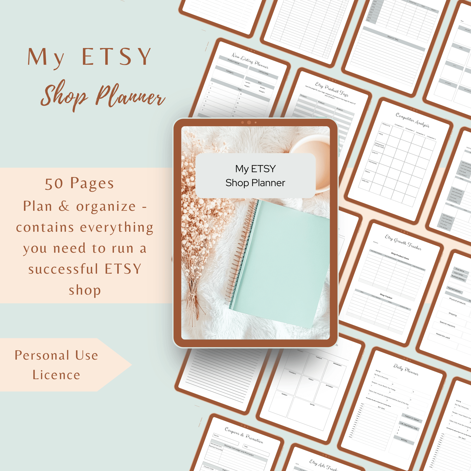 A beautifully designed 50-page planner made to help Etsy shop owners stay organized, track their sales, and grow with confidence. Instant PDF download - perfect for personal use!
