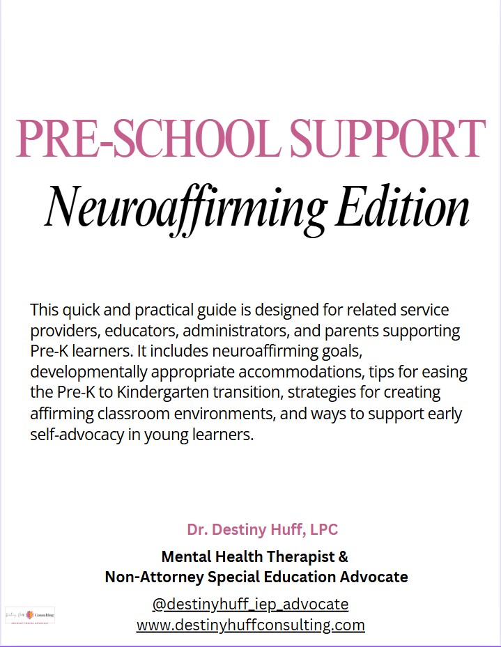This quick and practical guide is designed for related service providers, educators, administrators, and parents supporting Pre-K learners. It includes neuroaffirming goals, developmentally appropriate accommodations, tips for easing the Pre-K to Kindergarten transition, strategies for creating affirming classroom environments, and ways to support early self-advocacy in young learners.