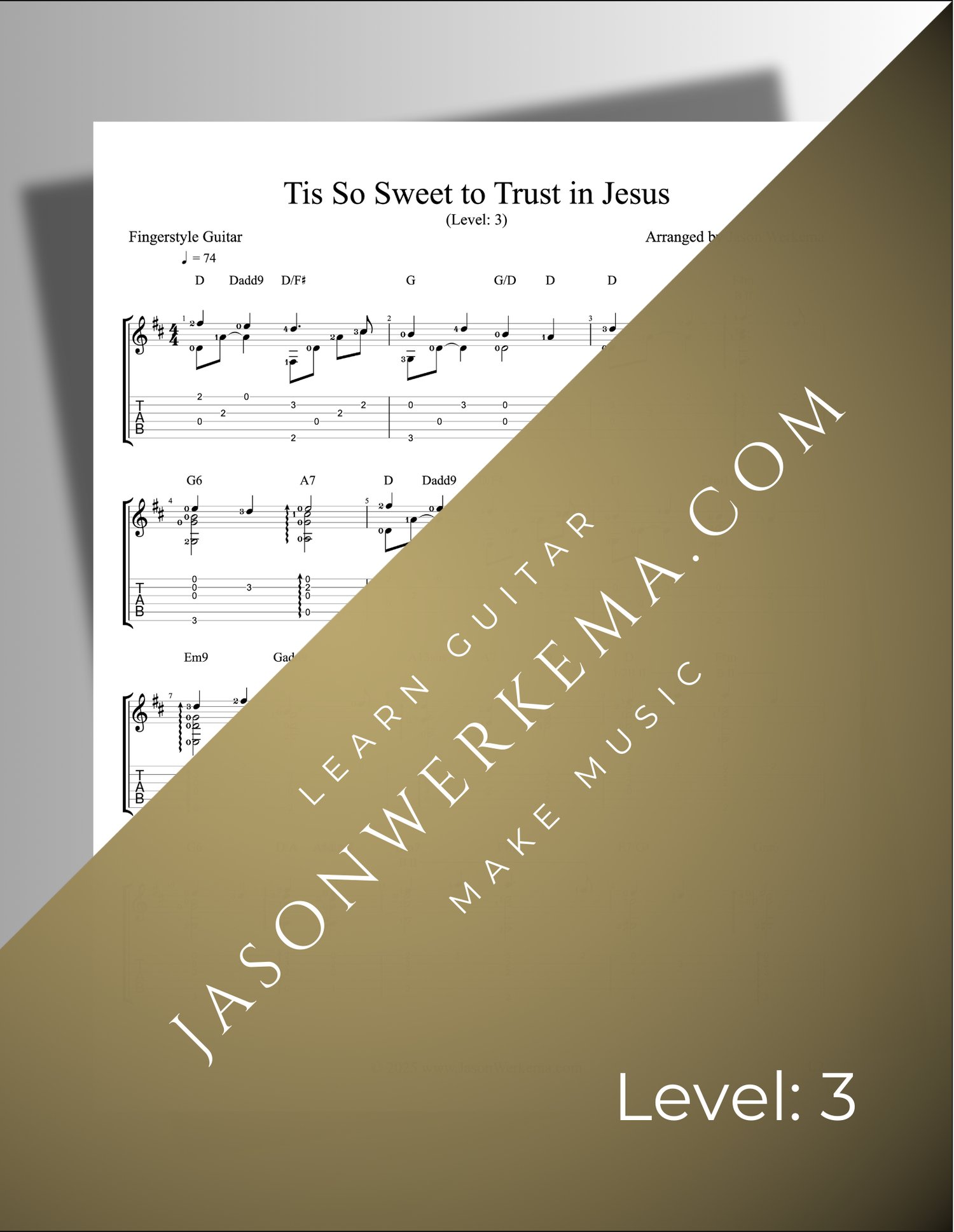 Fingerstyle guitar arrangement of "Tis So Sweet to Trust in Jesus" (level 3) with music notation, left-hand fingerings, chord symbols, TABs, and mp3 file.