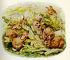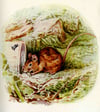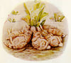 NOTE: After two full-length tales about rabbits, Potter had grown weary of the subject and was reluctant to write another. She realized however that children most enjoyed her rabbit stories and pictures, and so reached back to characters and plot elements from The Tale of Peter Rabbit (1902) and The Tale of Benjamin Bunny (1904) to create The Flopsy Bunnies. A semi-formal garden of archways and flowerbeds in Wales at the home of her uncle and aunt became the background for the illustrations.