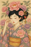 Step into the quiet elegance of winter with this enchanting digital print, featuring the Camellia (Tsubaki)—January's flower of grace and resilience. This illustration captures a serene kimono-clad maiden, gently surrounded by soft camellia blooms in warm pinks and deep greens. Her peaceful gaze and traditional hairstyle evoke a sense of calm reflection, perfect for beginning the year with intention and inner strength.
