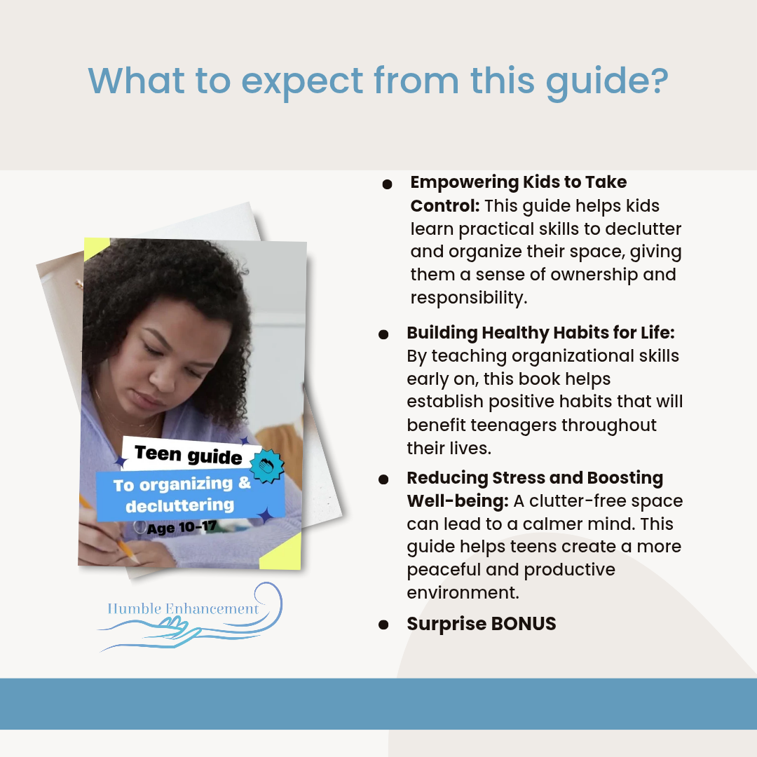 Stress and clutter can take a toll on teens. This Decluttering Teens Guide! offers a comprehensive guide for middle and high school students, teaching them how to declutter both their space and mind. This book provides practical tips for time management, organization, and stress reduction, making it easier for teens to focus, be productive, and embrace responsibility.
