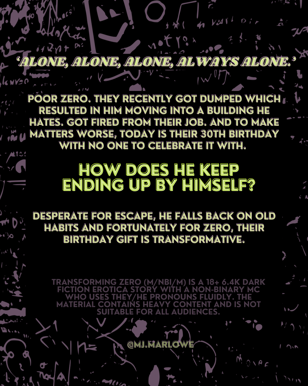 Transforming Zero (M/Nbi/M) is a 18+ 6.4k dark fiction story with a non-binary MC who uses They/He pronouns fluidly. The material contains heavy content and is not suitable for all audiences. Please download a PREVIEW to view the content notes if needed. Otherwise, the content list can also be found inside the book