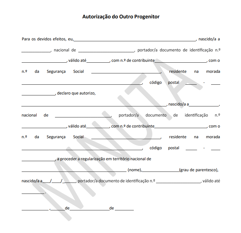 A Autorização do Outro Progenitor é um documento formal exigido pela AIMA que serve para autorizar a realização de determinadas ações ou decisões que envolvem os filhos menores. Esta minuta é essencial em situações como viagens, registo em instituições de ensino, ou outras formalidades que requerem o consentimento do progenitor que não está presente.