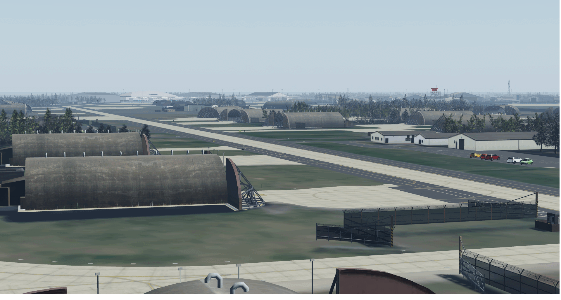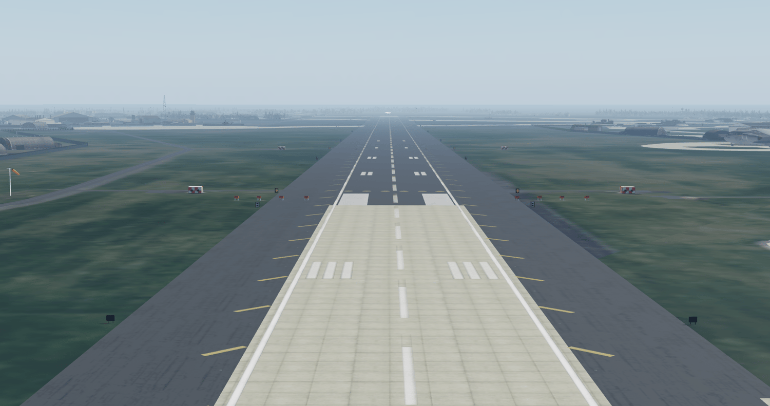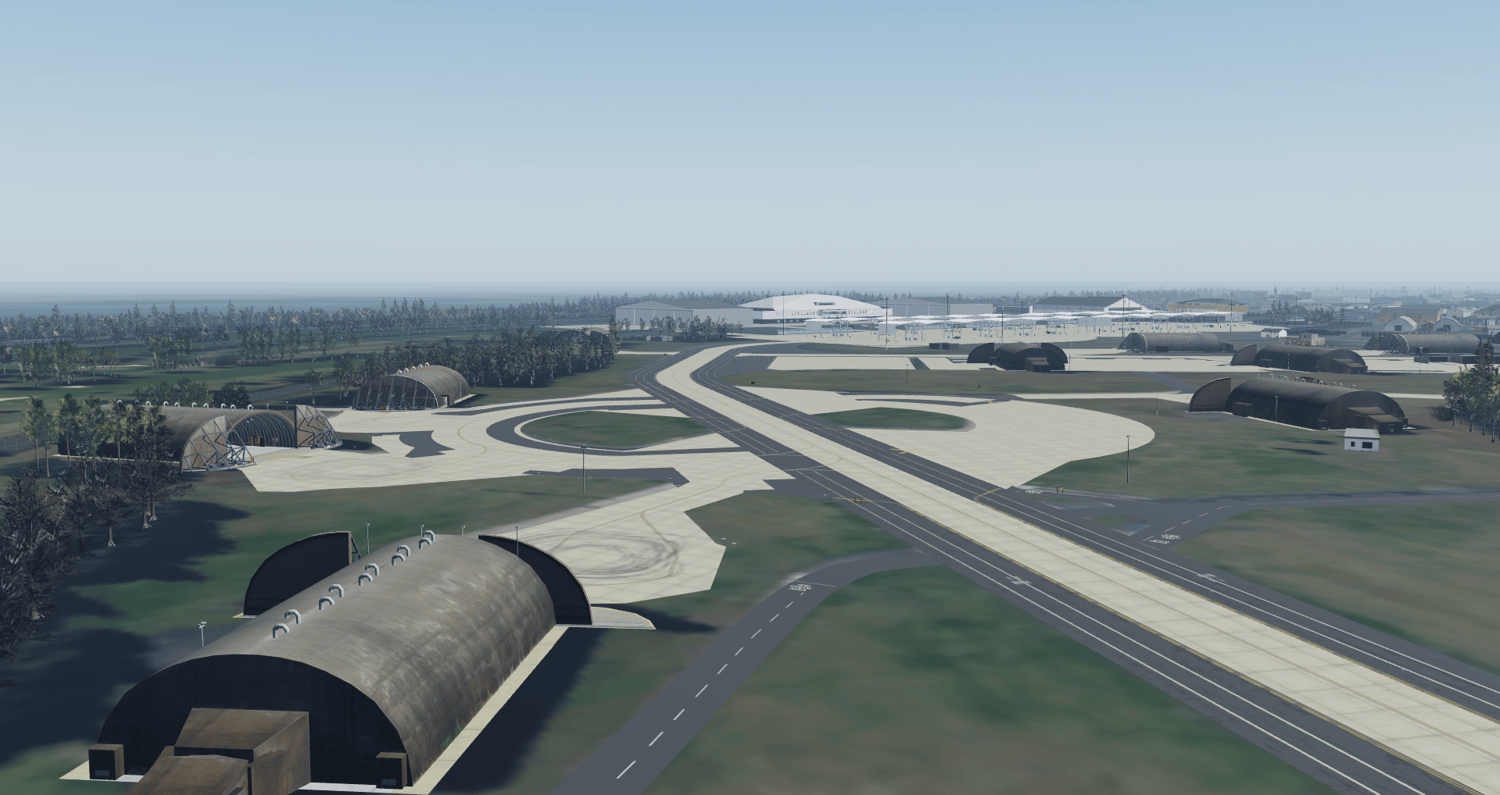 Full recreation of RAF Lakenheath’s modern base layout, including runways, taxiways, and aircraft shelters.