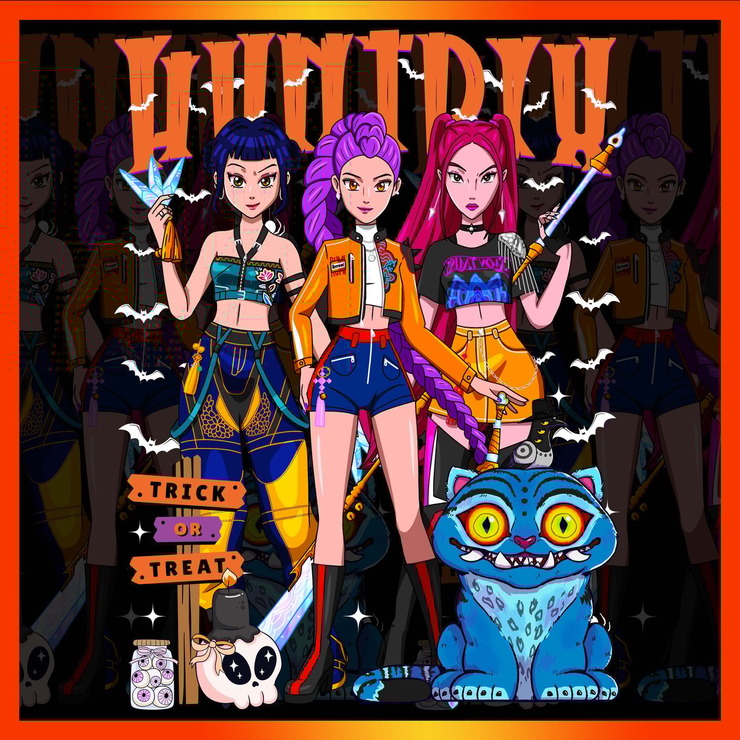 Step into the dark and stylish world of Halloween with the Huntrix Halloween Edition — a unique edition of anime-inspired digital artworks designed to make your products stand out this spooky season.