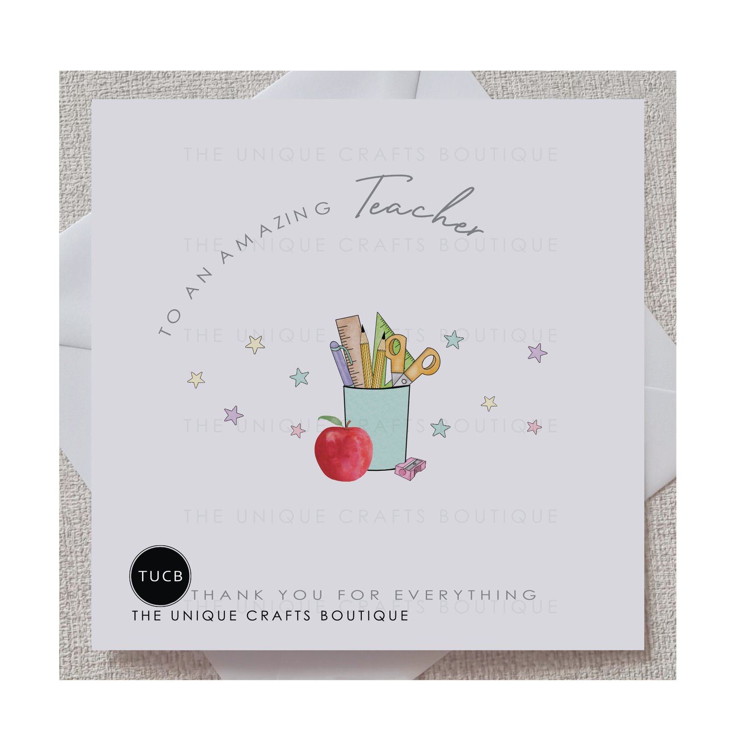 Be sure to show your teacher some appreciation with this cute colourful stationary and star design. Displaying the message ' To an amazing Teacher, Thank you for everything you do'.