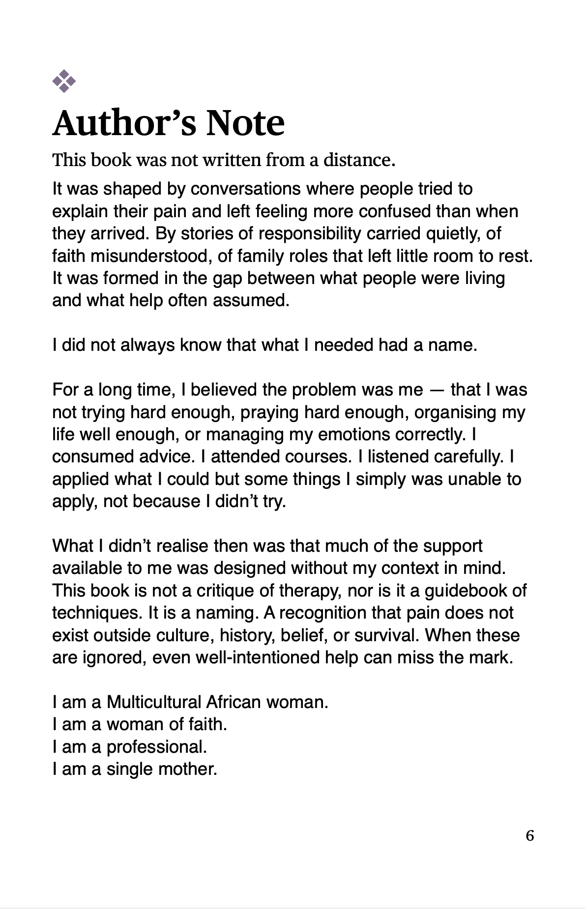 Context Is Not Optional is a reflective, deeply human exploration of what happens when healing is approached without full understanding of culture, faith, family, responsibility, and survival. It speaks to those who have felt unseen or misunderstood in spaces meant to support them, as well as to practitioners who sense that care loses its power when context is overlooked.