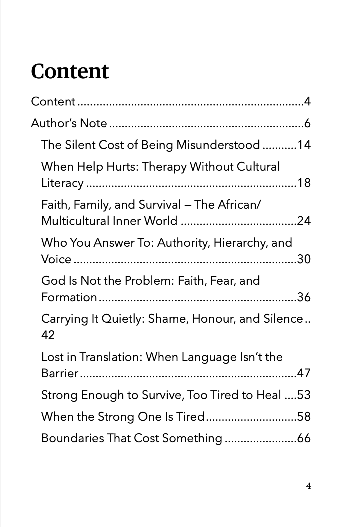 Rather than offering techniques, diagnoses, or step-by-step solutions, this book slows the conversation down. It names the quiet costs of being misunderstood: the exhaustion of self-translation, the burden of being “the strong one,” the moral tension around boundaries and rest, the grief of migration that has no single object, and the loneliness of carrying responsibility without language or relief.