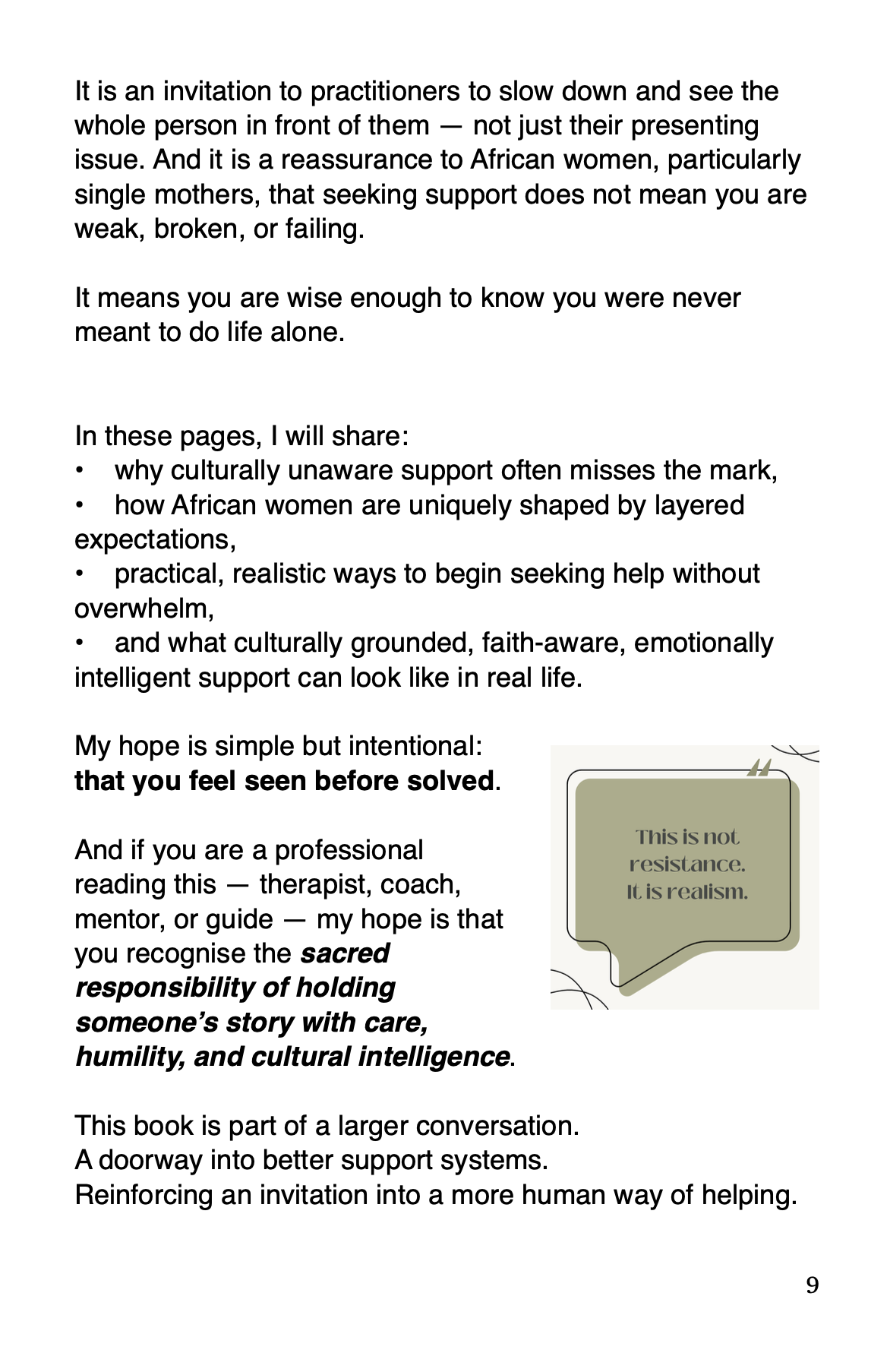The book unfolds in three parts. The first names the harm that occurs when care is offered without cultural awareness. The second explores the invisible weight many people carry as a result. The third turns toward what healing can look like when understanding, humility, and context are honoured—not as an add-on, but as foundational.