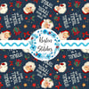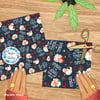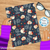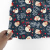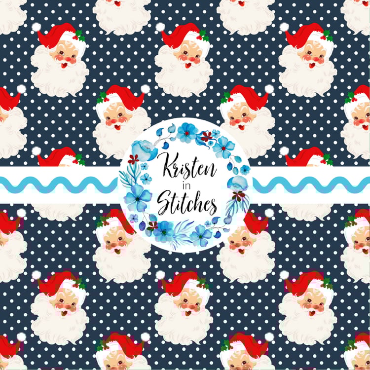 Don't get your tinsel in a tangle! Retro Santa faces and gifts on navy.