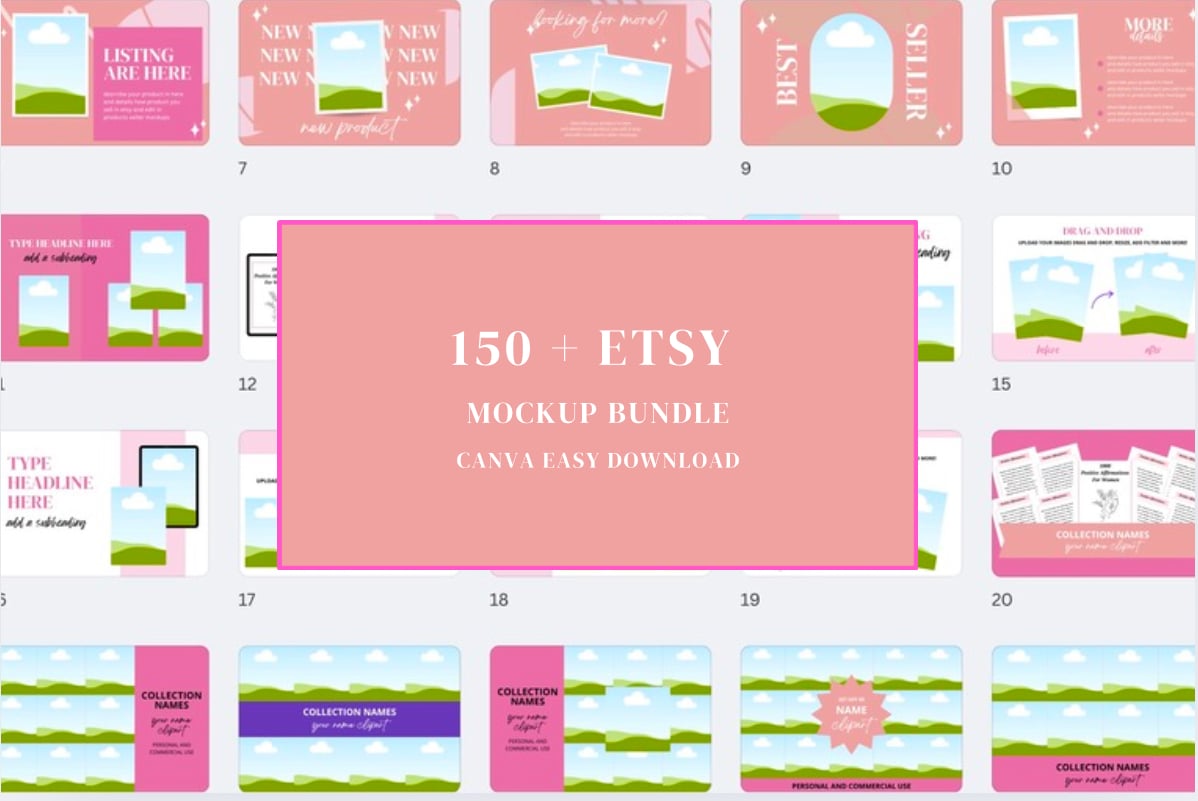 This is one of the best deals to come across. In this HUGE bundle you’ll receive 150+ Canva mockups that can be used for Etsy, websites… etc
