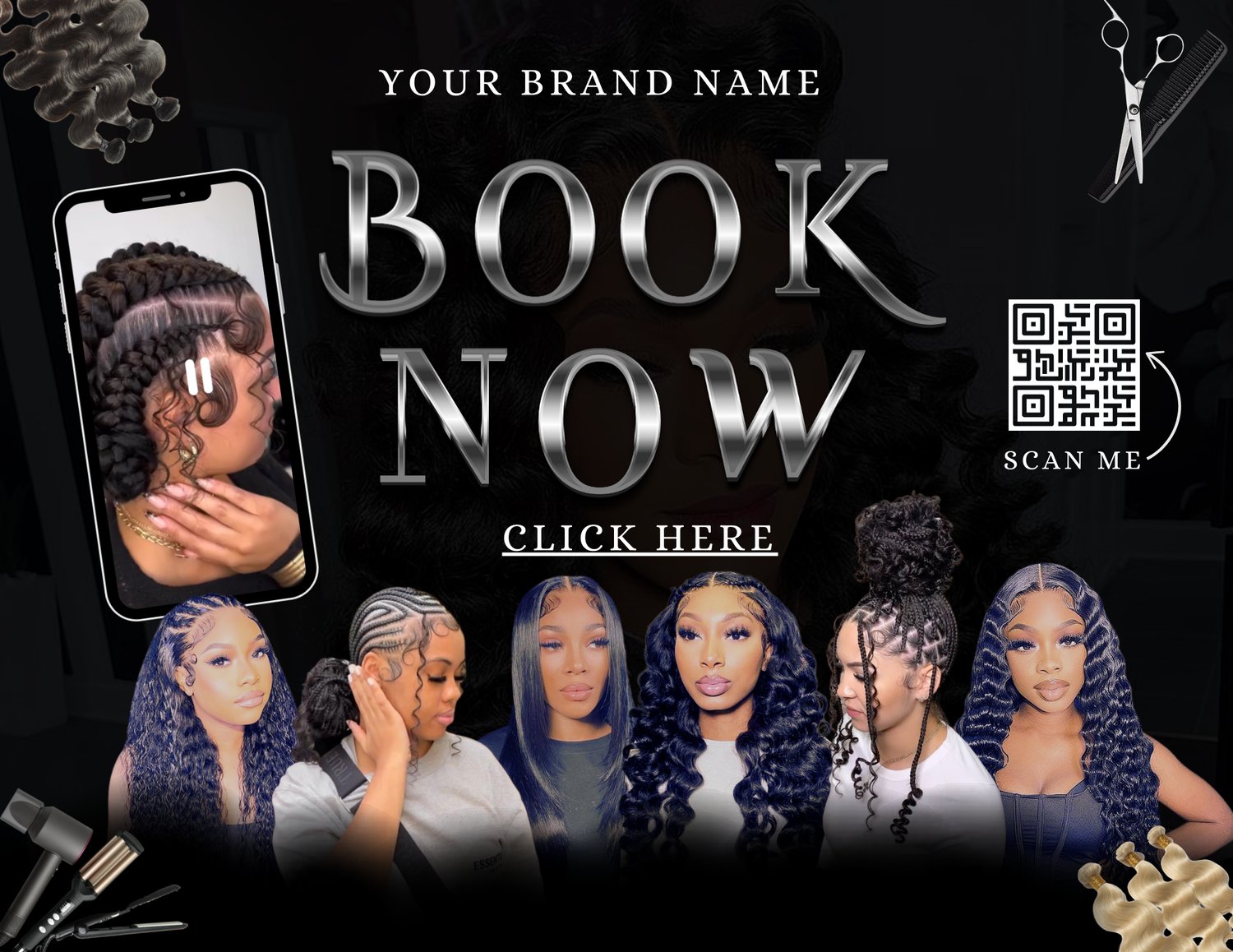 Stylist Booking Template that can be edited in various way to your likening. Please note product is a "digital" file only. This will require you to have/use Canva (Free or Pro version). This flyer is MP4 meaning, there is a video playing in the cell phone. If your desire is a photo on the phone instead of a video, you have the ability to change it. Please note ALL SALES ARE FINAL..NO REFUNDS!!!