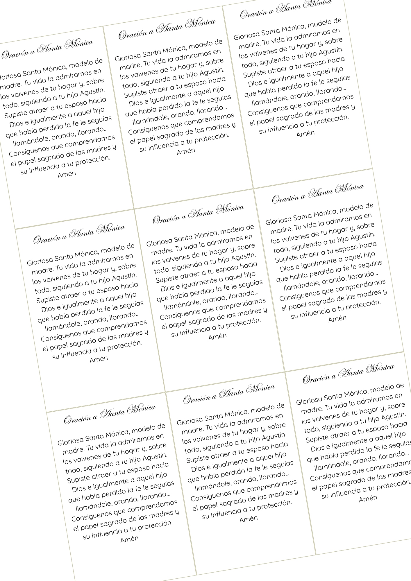 Archivo digital en PDF con estampitas de Santa Mónica listas para imprimir. Incluye imagen del santo y oración en el reverso. Ideal para catequesis, evangelización, parroquias o uso personal.