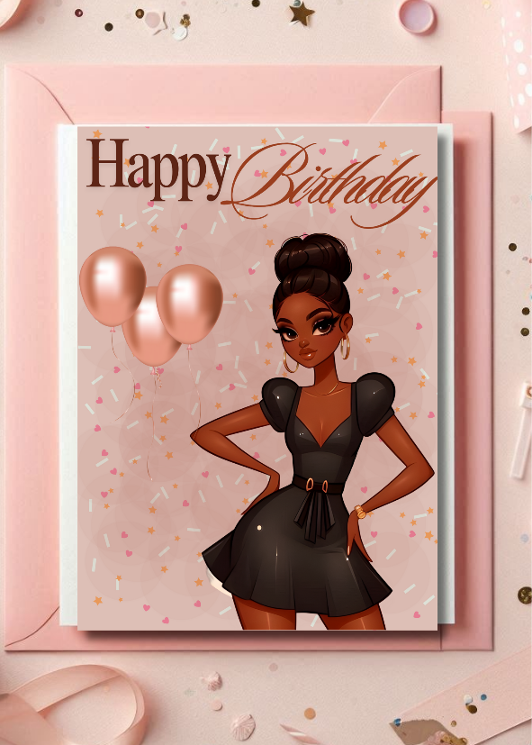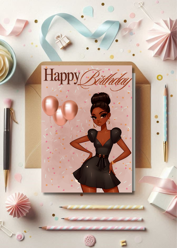 Celebrate her special day with our stunning "Elegant Celebration" digital birthday card, designed specifically for the stylish Black woman in your life! This high-quality, printable eCard features a chic illustration of a fashionable Black woman in a glamorous black dress, adorned with elegant rose gold balloons.