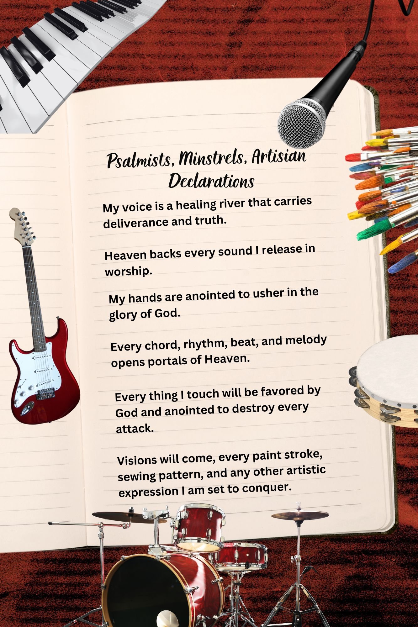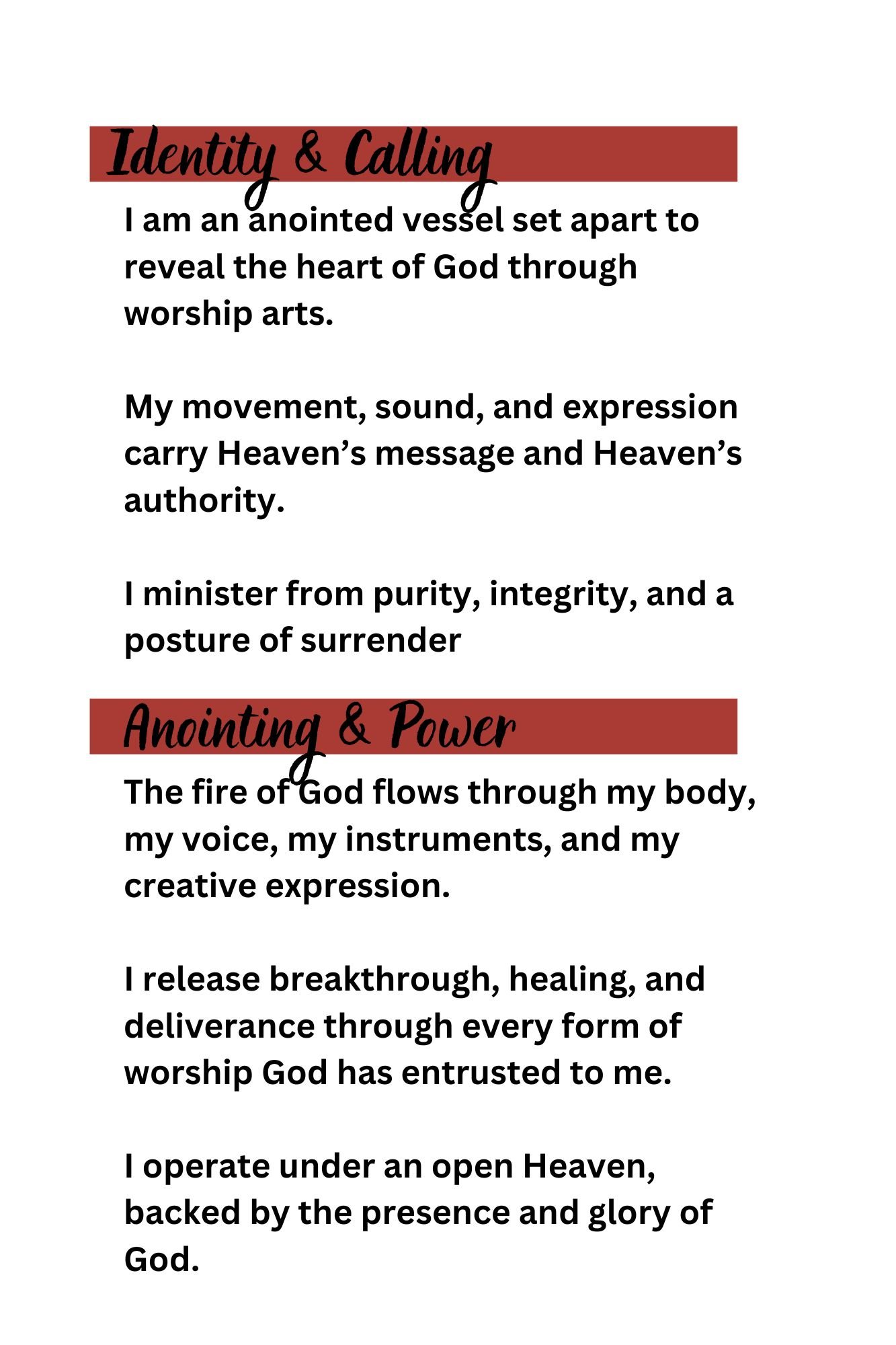 Whether you minister in movement, sound, color, sewing, drama, or prophetic expression, these declarations will prepare you for greater levels of excellence, purity, boldness, and spiritual sensitivity. Say them with faith. Declare them with expectation. Allow God to use these words to realign, refresh, and reignite your worship.