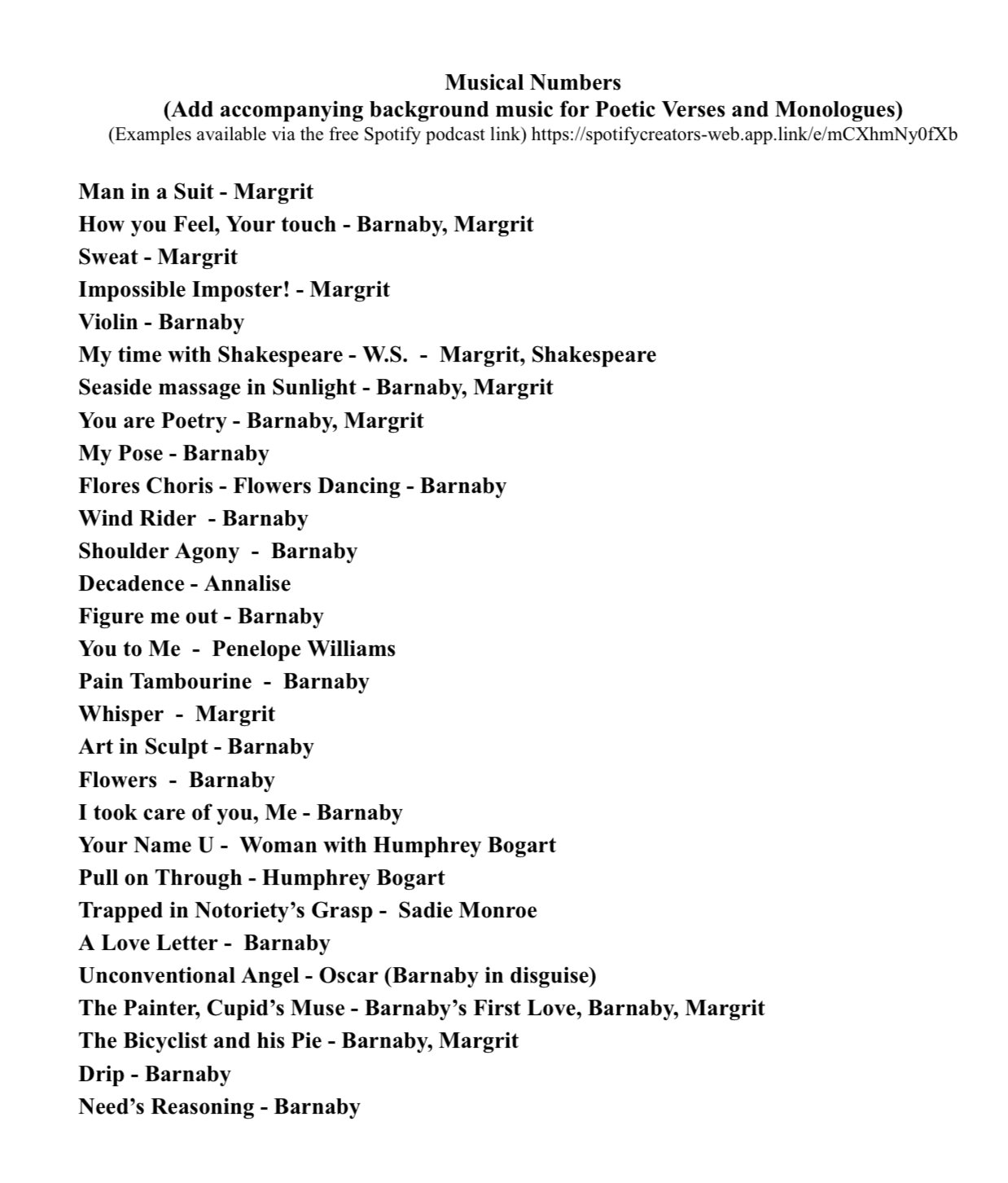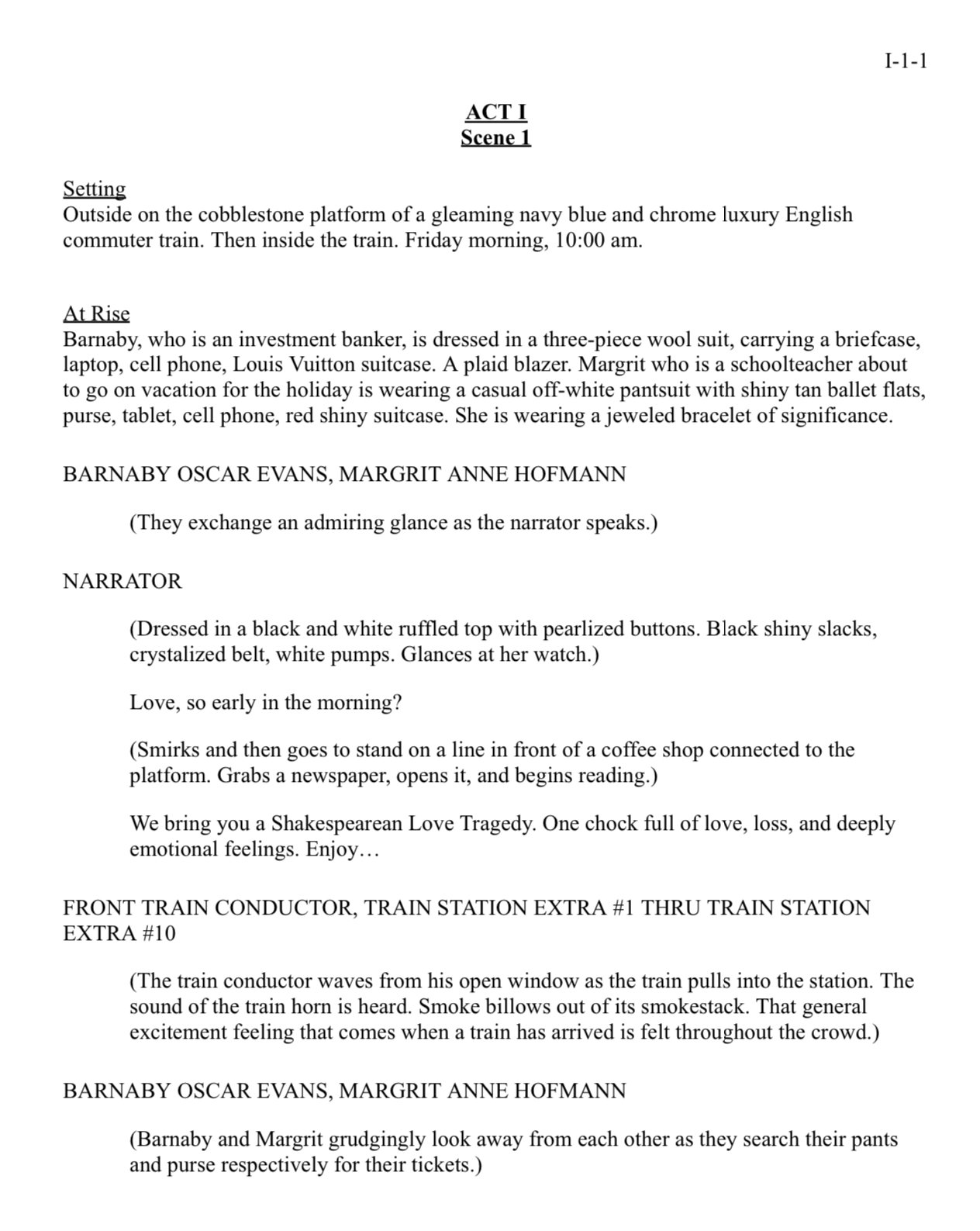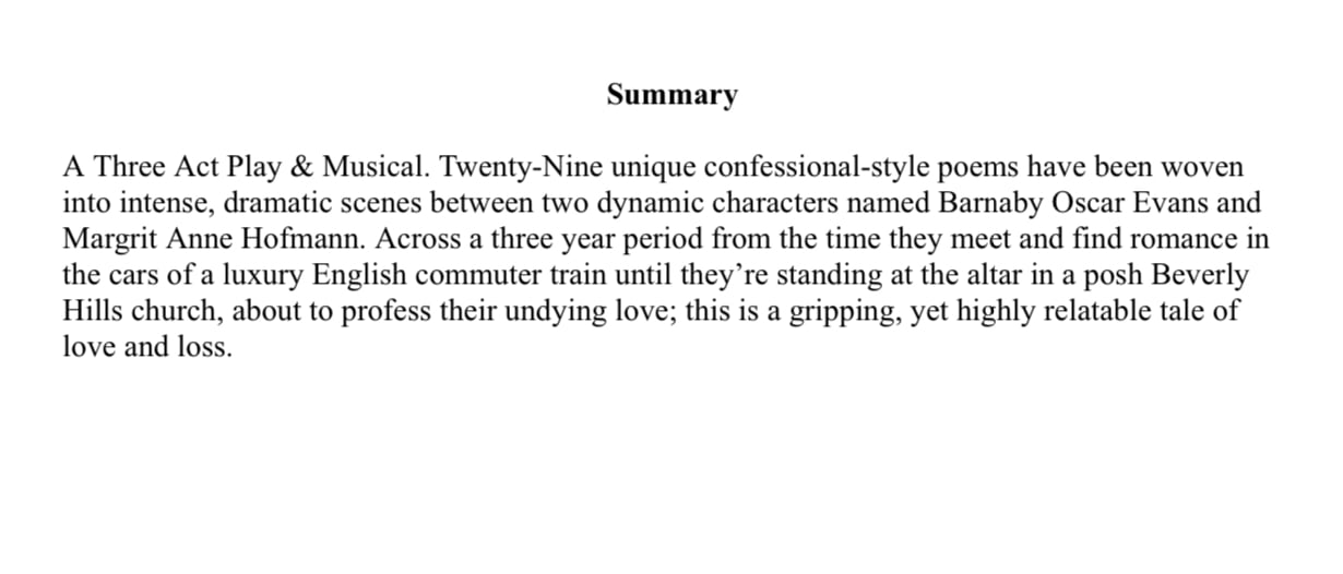 A Three Act Play & Musical. Twenty-Nine unique confessional-style poems have been woven into intense, dramatic scenes between two dynamic characters named Barnaby Oscar Evans and Margrit Anne Hofmann. Across a three year period from the time they meet and find romance in the cars of a luxury English commuter train until they’re standing at the altar in a posh Beverly Hills church, about to profess their undying love; this is a gripping, yet highly relatable tale of love and loss.