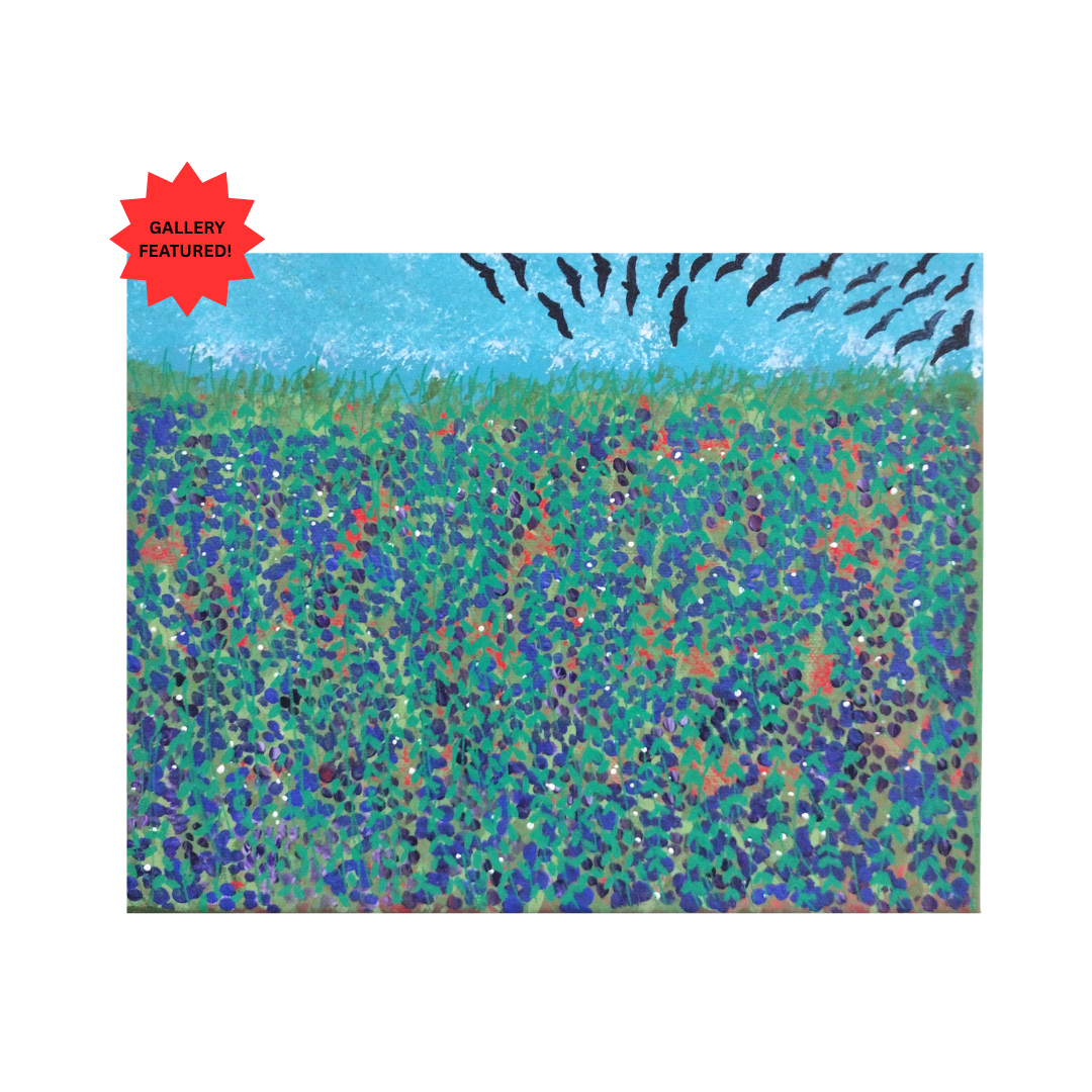 Painting of a field of indigo crops on medium 8x10 canvas.