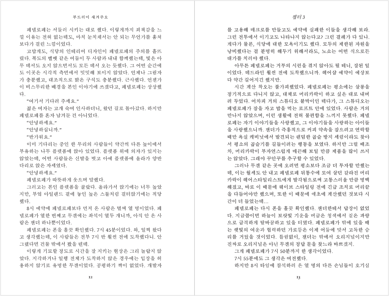 드디어! 짝사랑 상대가 페넬로페를 무겐에서의 저녁 식사에 초대했다. 예약이 불가능한 것이나 다름없는 오마카세 식당이자, “무한과 의도가 만나는 곳”이라는 무겐. 페넬로페는 이곳에 꽃피는 사랑을 기대하며 도착한다. 미식의 즐거움을 담는 일러스트레이션에 영감까지 된다면 덤이고.