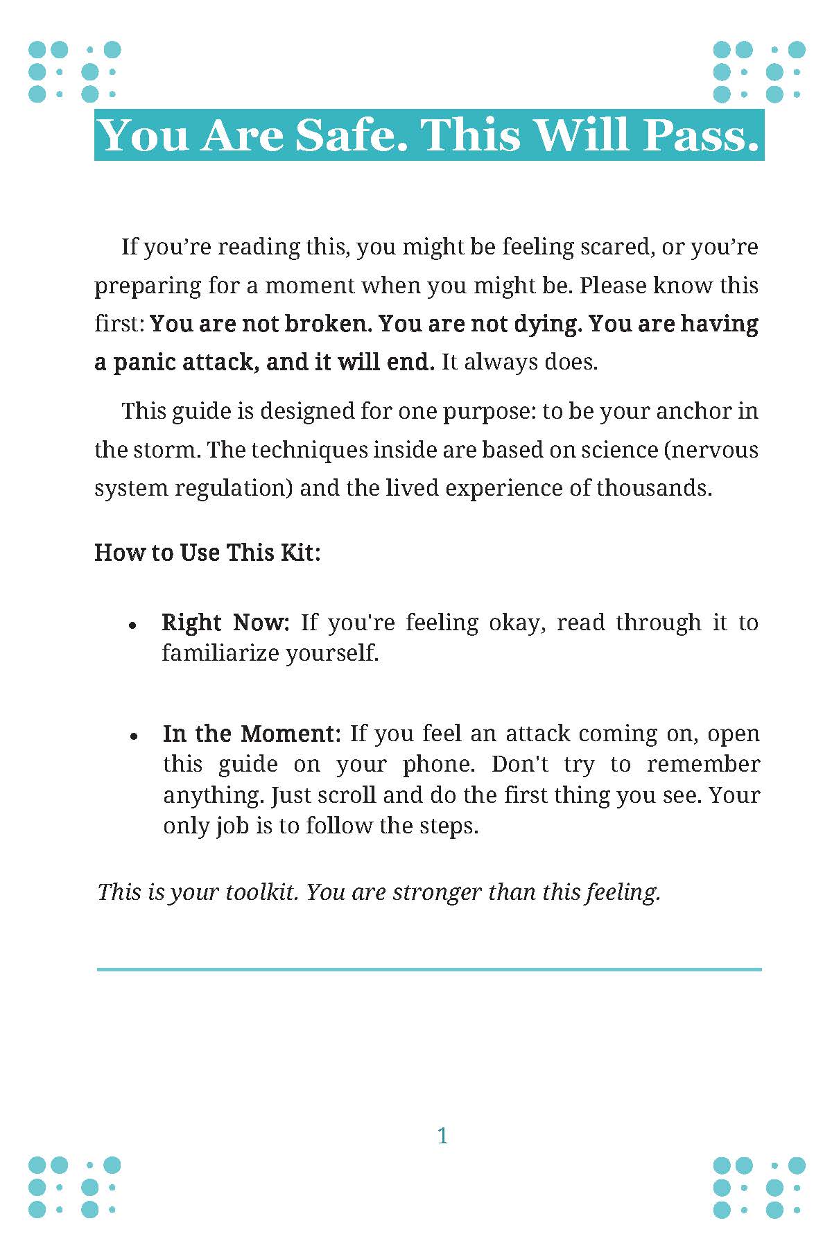 Introducing The First Aid Kit for Panic Attacks – a simple, portable, and immediate PDF guide designed to be opened on your phone the moment you feel an attack coming on. This is your digital anchor, providing clear, step-by-step techniques to ride out the wave and return to calm.