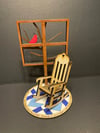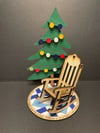 Save a Chair Single is laser cut of birch and hand painted. This set comes w a rembernce rugs one rocking chair, a window with one cardinal and a Christmas tree.it measures 8.5X11" and can be purchased painted or blank
