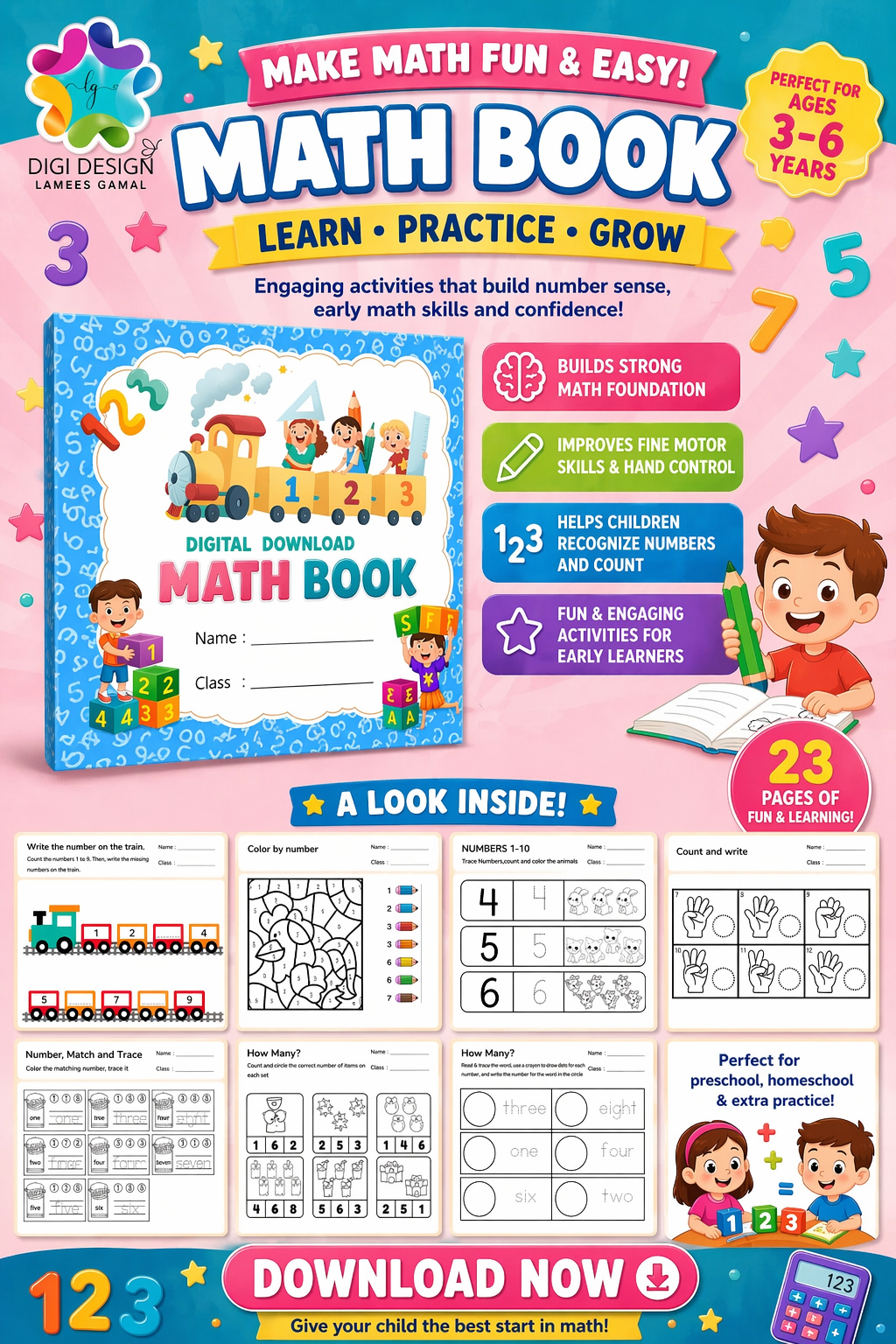 Help your child build a strong mathematical foundation with this engaging Digital Math Activity Book. Designed specifically for children aged 3 to 6 years, this 23-page printable workbook is packed with fun activities that turn early learning into an exciting adventure.