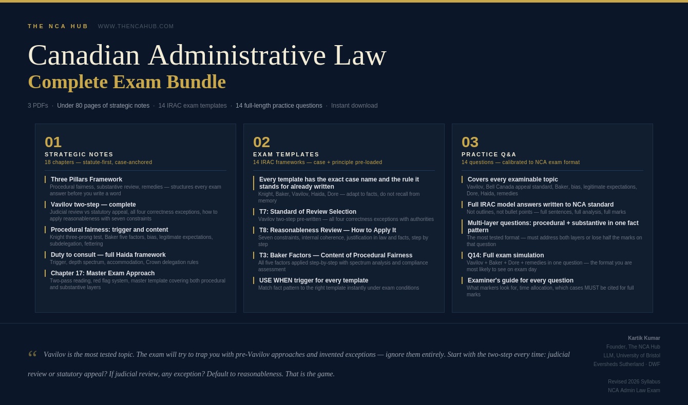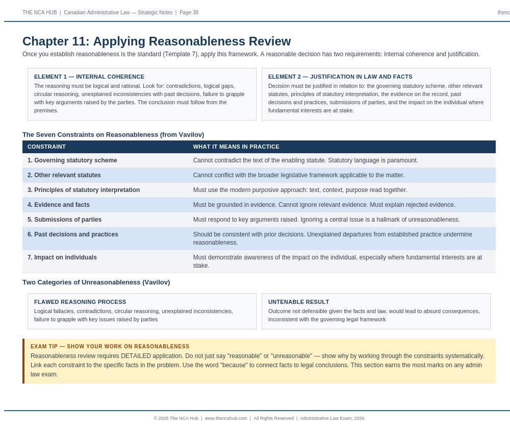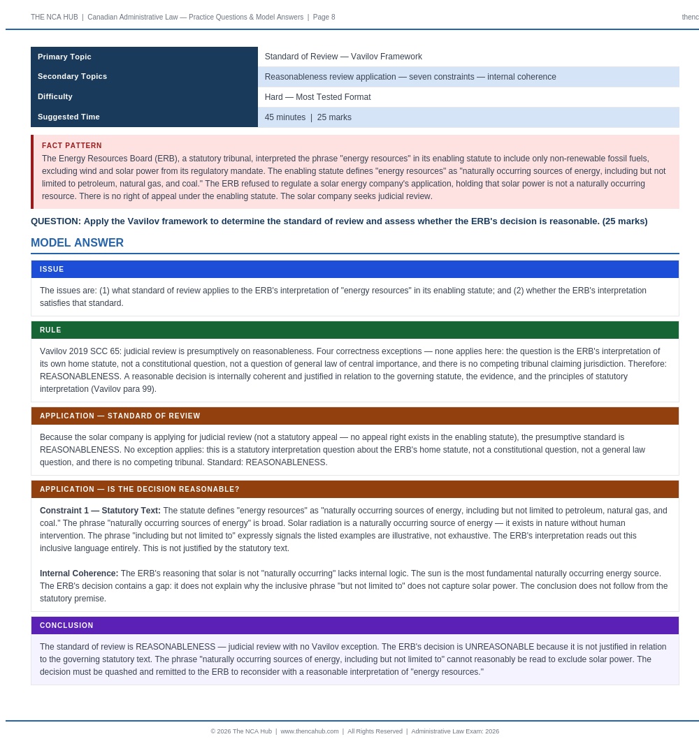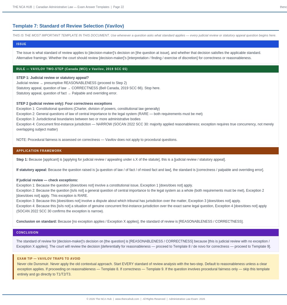 Fully aligned with the current NCA Administrative Law syllabus. Vavilov framework, SOCAN 2022 SCC 30, Carrier Sekani, and all current authorities included.