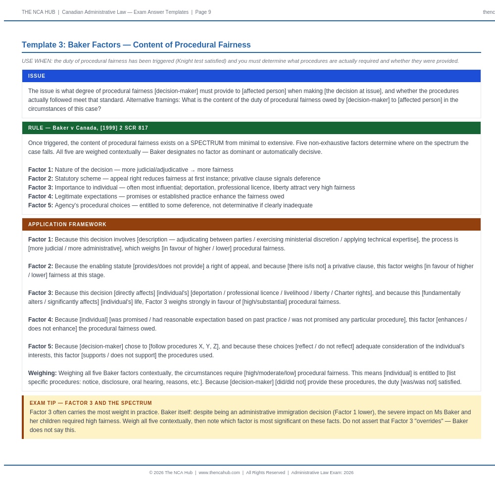 Chapter 17 is a complete exam approach system: how to read the fact pattern in two passes, procedural red flags that trigger fairness analysis, substantive red flags that trigger Vavilov analysis, and a Master Exam Answer Template covering both layers systematically so nothing gets missed.