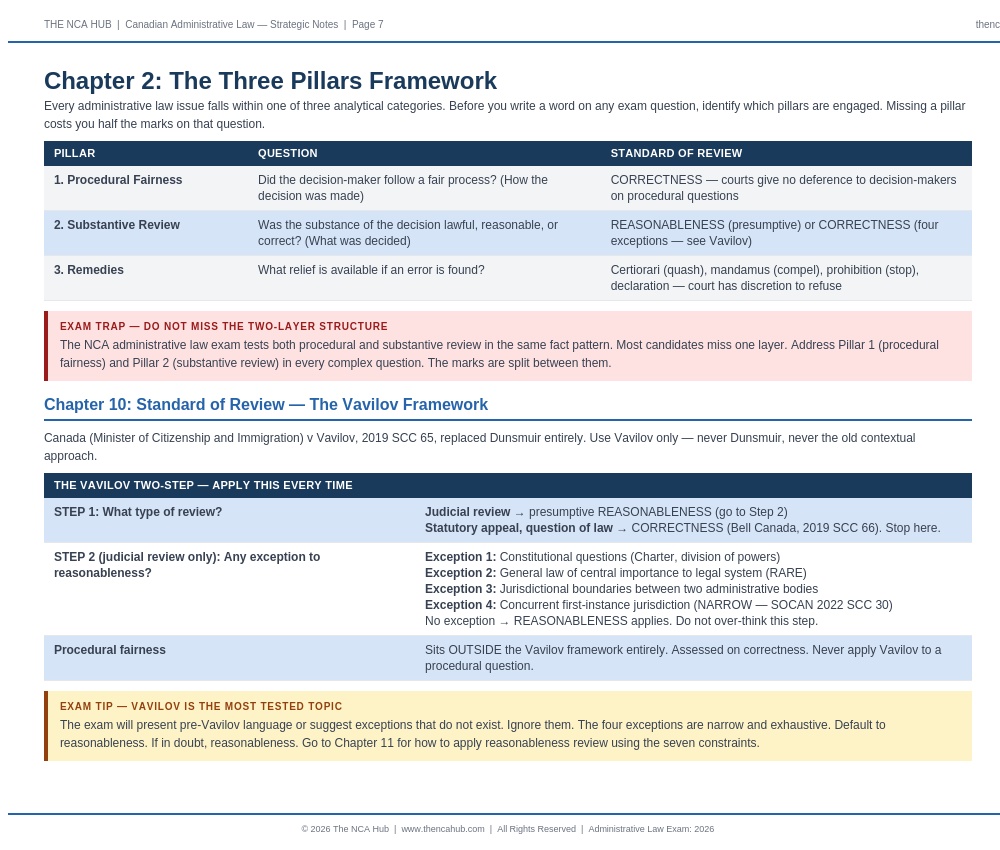 The notes open with the Three Pillars Framework, the three analytical categories that structure every possible administrative law question. Pillar 1 is procedural fairness. Pillar 2 is substantive review. Pillar 3 is remedies. Before you write a word on any exam question, you know which pillars are engaged and which tests apply to each.