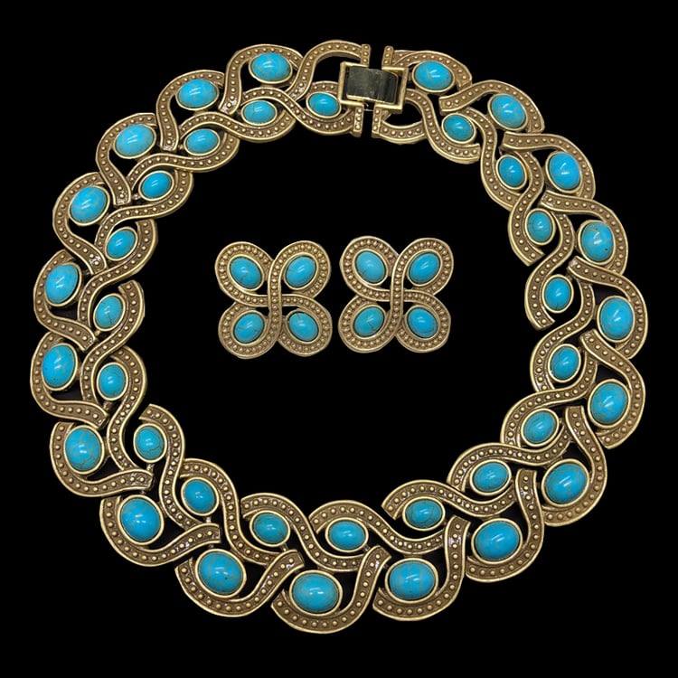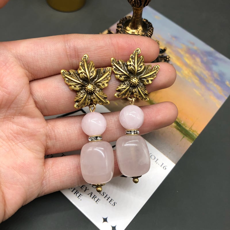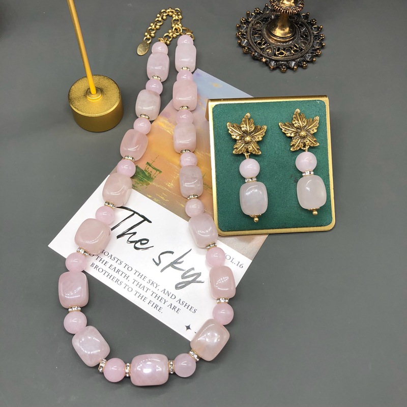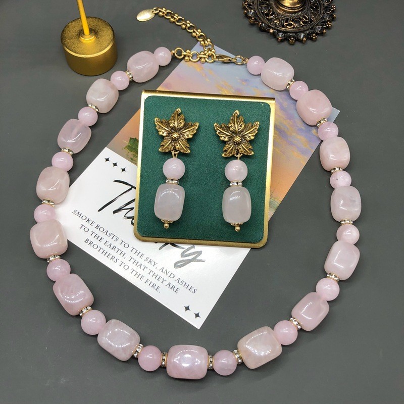 French vintage pink spar beaded earrings necklace set