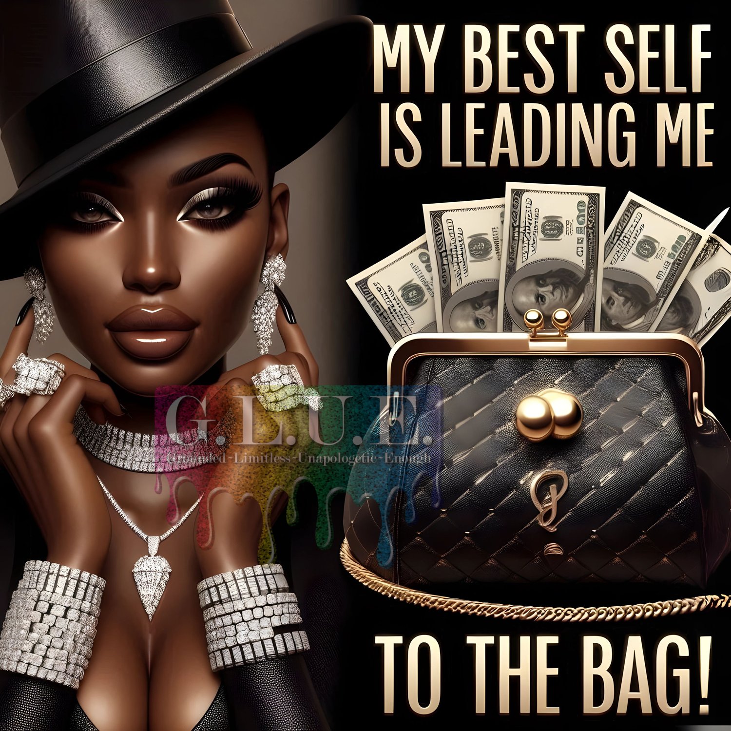 My Best Self Is Leading Me to the Bag - CL PNG | Glam Luxe Black Woman Art | Motivational Self-Work Quote