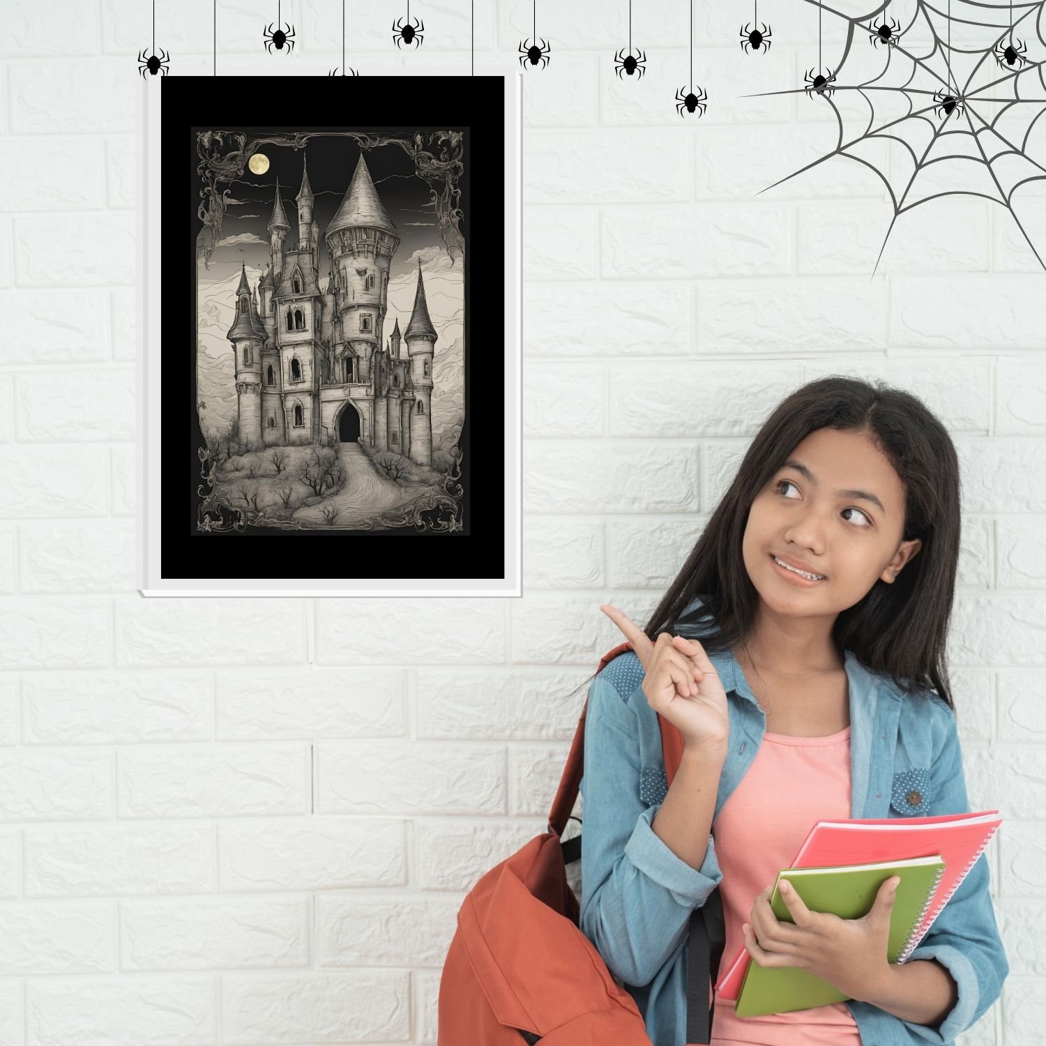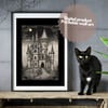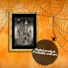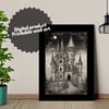 Creepy castle at halloween night. Printable decoration for party. Vintage wall art