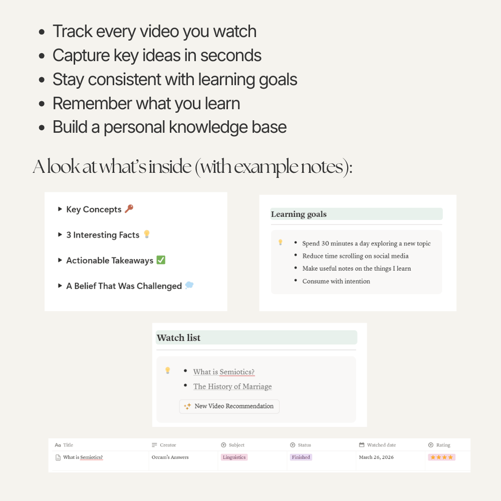 As part of that, I noticed I was watching a lot of YouTube but forgetting most of what I watched soon after. I needed a simple way to keep track of what I was learning and make it stick. This template is the system I built for myself to organise videos, take simple notes, and actually remember what I learn.