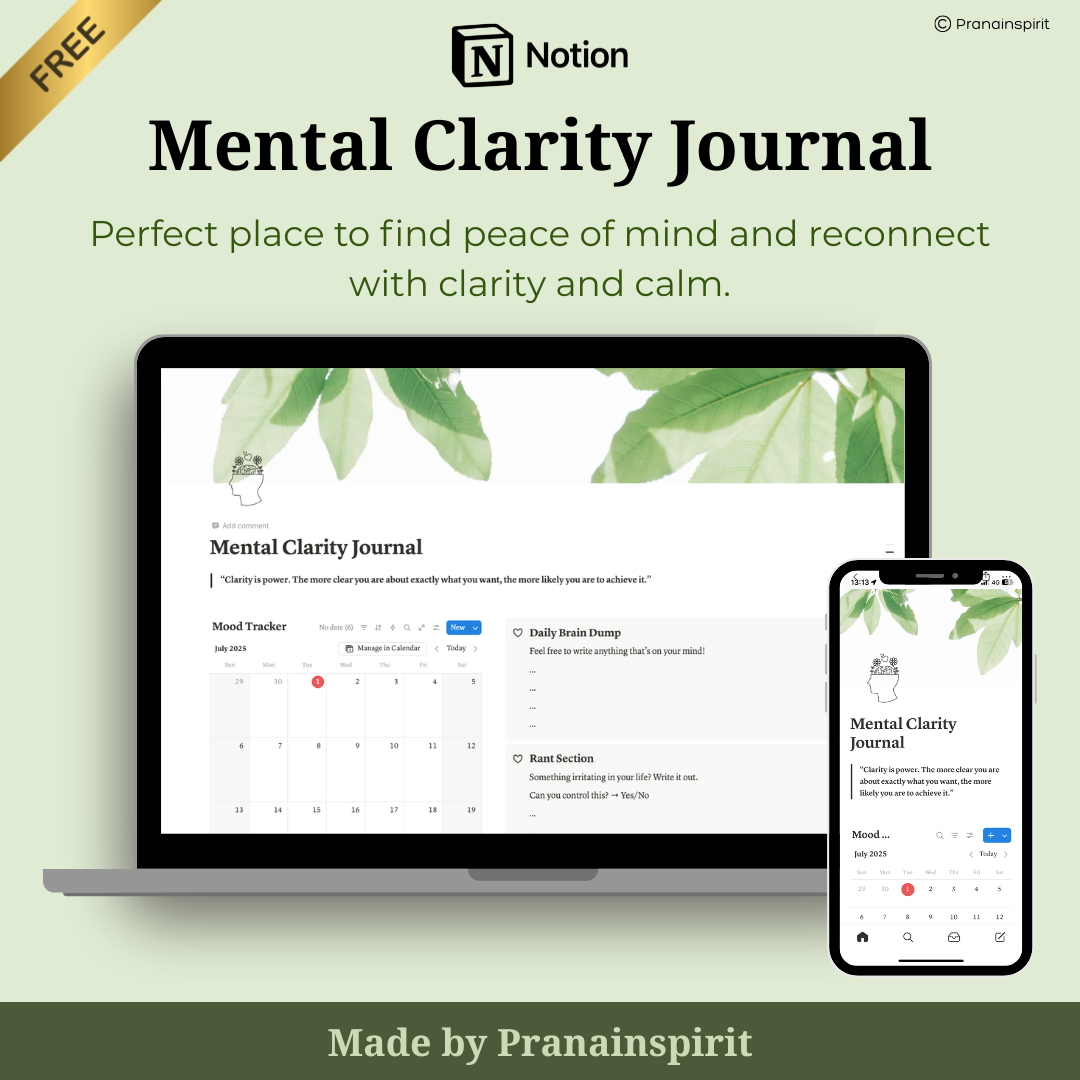Keywords: mental clarity journal, notion template, mindfulness planner, self-care notion, mood tracker, guided journaling, aesthetic dashboard, calm music, nature sounds, intention setting, mental wellness, digital journal, daily reflection, green notion template, habit tracker, mental health tools, inner peace, mindful productivity, emotional tracking, slow living