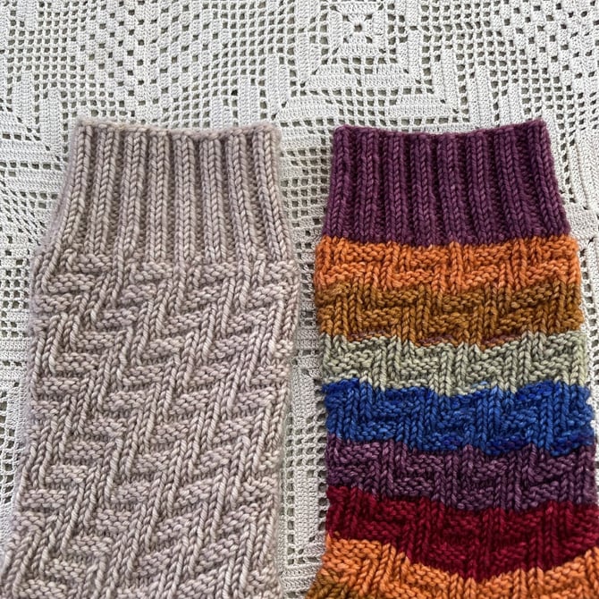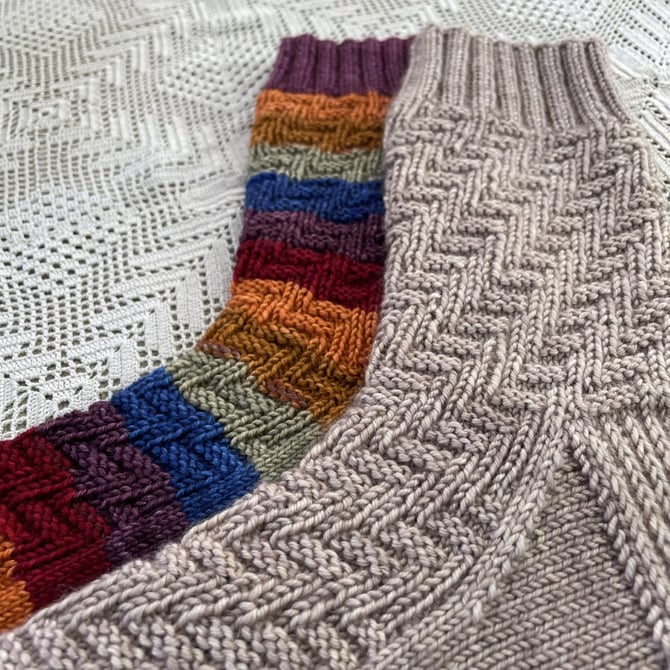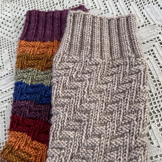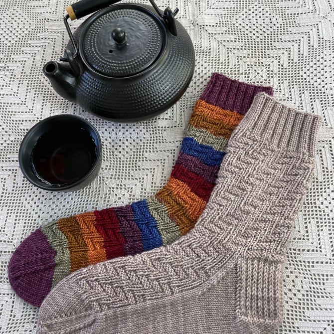 These socks are a fun way to add texture to self striping or tonal yarns! The patterning only requires knit and purl stitches, and since every second row is a repeat of the one before it makes for relaxed knitting.