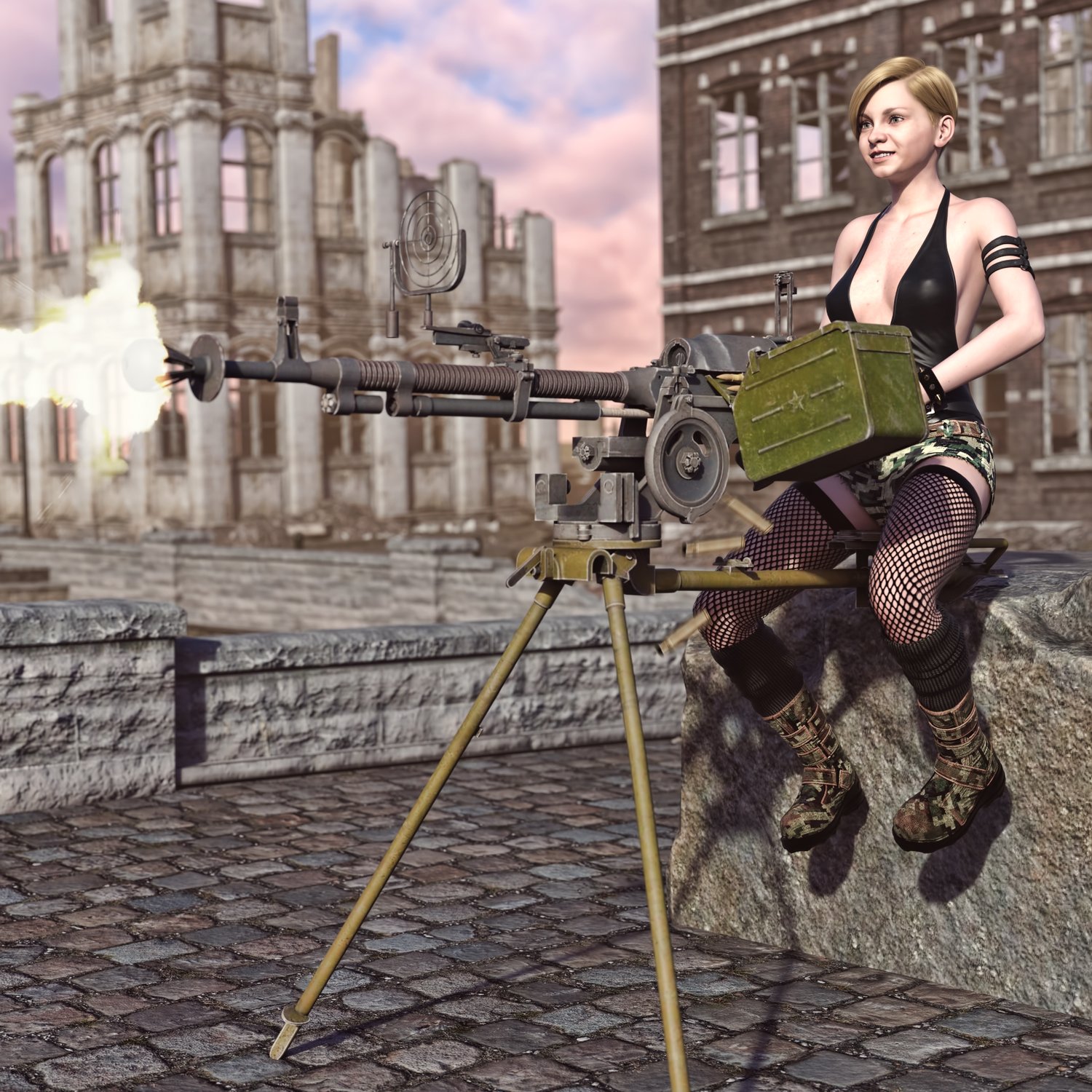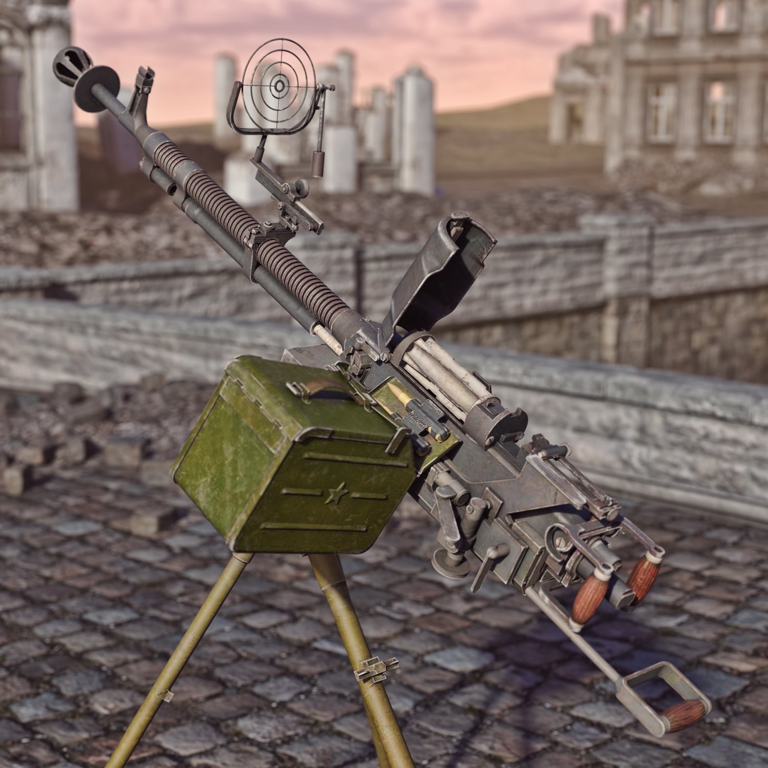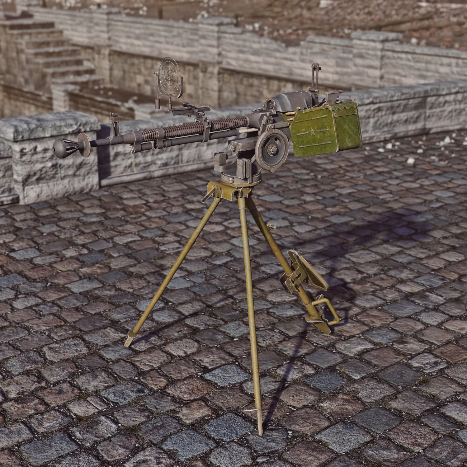 A heavy Soviet machine gun mounted on metallic tripod. The prop is rigged and converted for use with DAZ. The legs, rotating part, pivoting part also rigged for more realistic pictures. The tripod can be hidden so you can use this gun on any other vehicle or placement. The legs are pretty flexible so the sentry gun can be mounted in tight places. One of the legs also includes a seat.