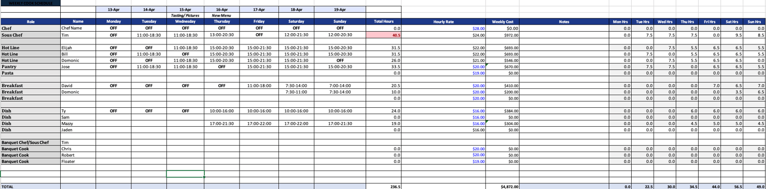 This 2-sheet system covers the full weekly scheduling workflow from shift entry to labor cost summary. Built for kitchens running multiple BOH roles including hot line, pantry, pasta, breakfast, banquet, and dish.
