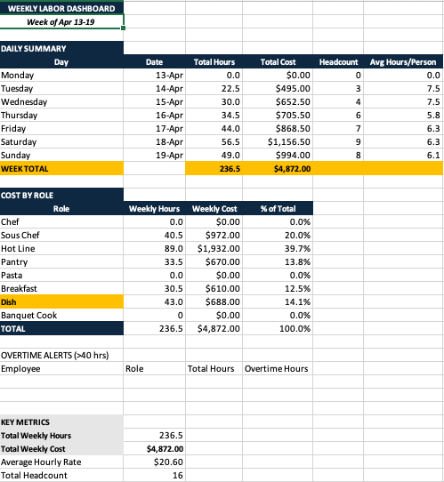 Weekly Labor Dashboard: daily summary of total hours, total cost, and headcount across the week, cost breakdown by role, overtime alert table flagging anyone over 40 hours, and key metrics including total weekly hours, total weekly cost, average hourly rate, and total headcount