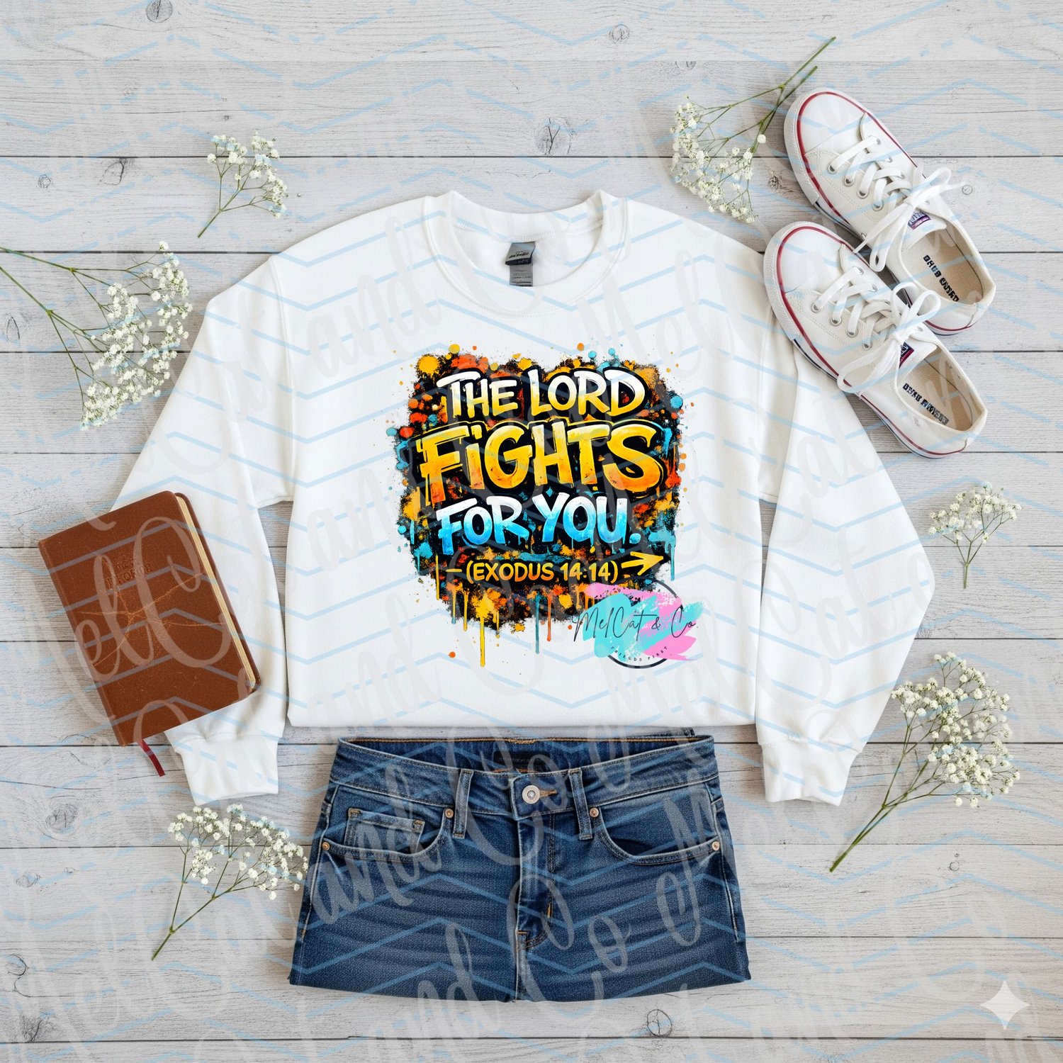 Make a bold statement of faith with our “The Lord Fights for You” Graffiti Faith Apparel, inspired by Exodus 14:14. This powerful design blends vibrant street-art style lettering with dynamic paint splashes and drip effects, creating a modern Christian message that stands out with confidence and strength.