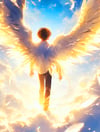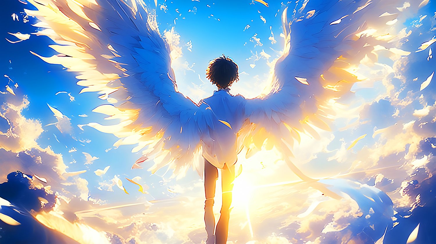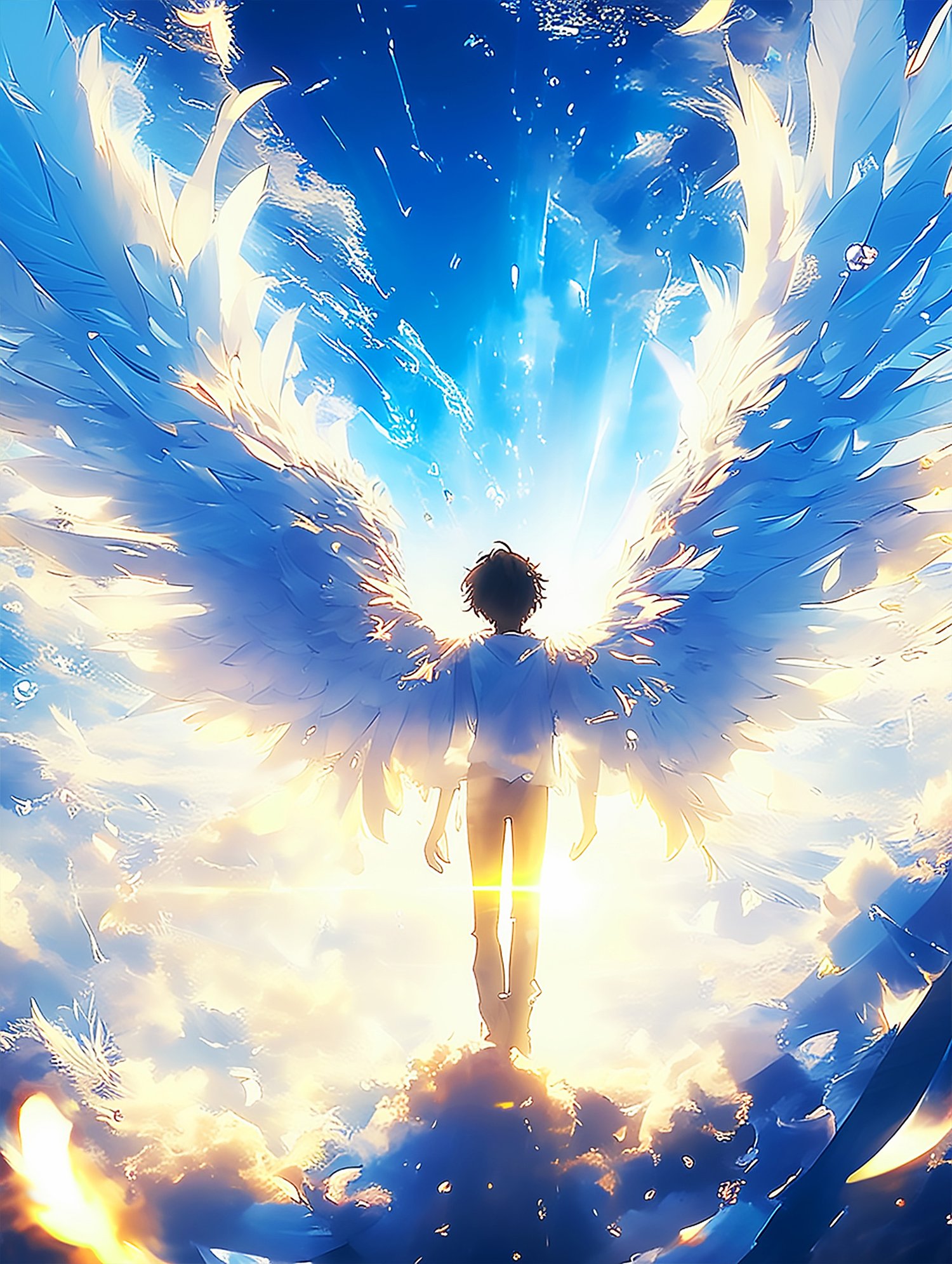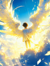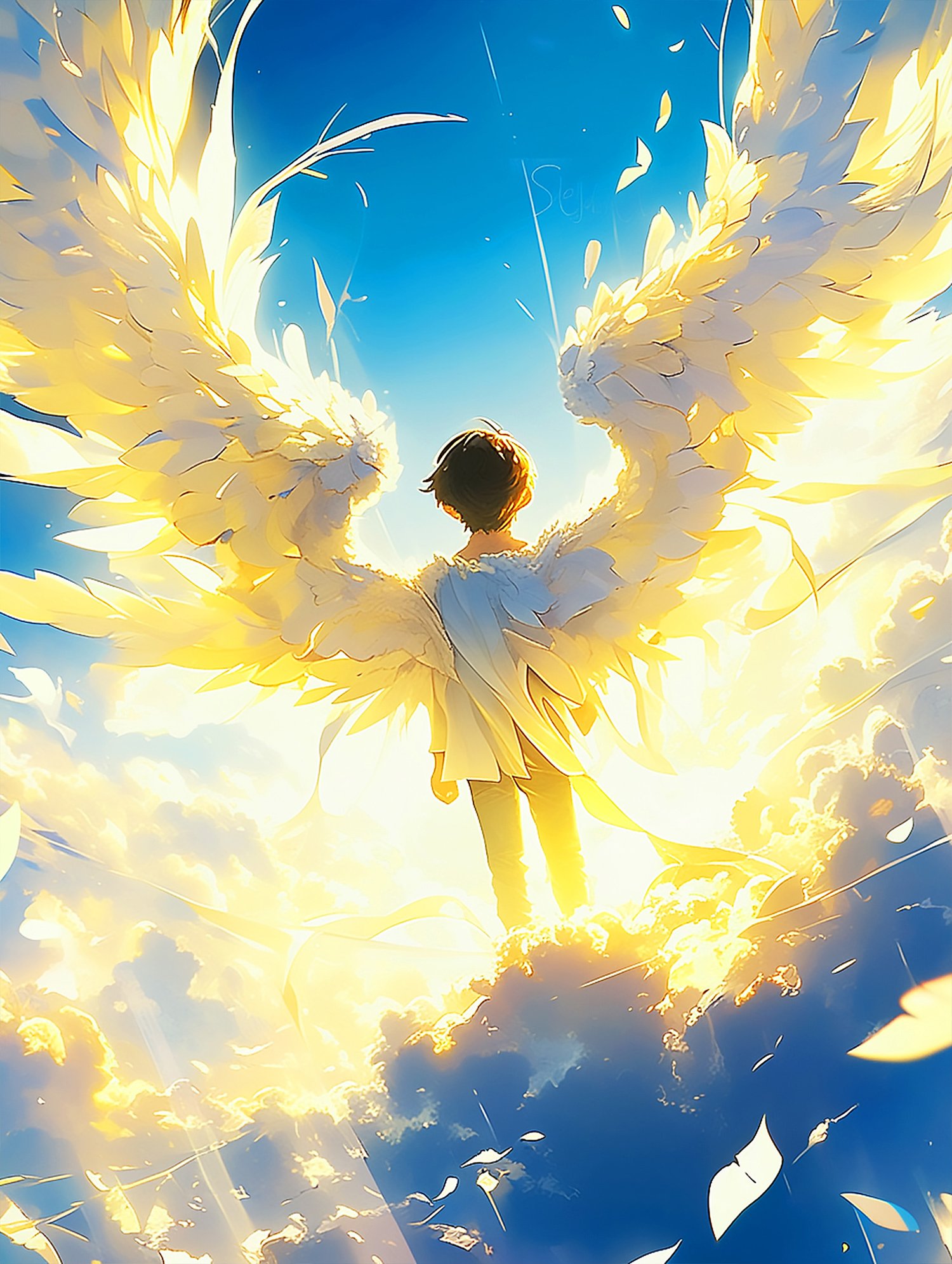 Ethereal Winged Boy - Anime Art: Dive into a world of wonder with this stunning digital artwork featuring an anime-style young boy with luminous angel wings, standing amidst a vibrant sky of floating feathers and golden light. Perfect for fans of fantasy and angelic themes, this high-resolution image captures the essence of hope, strength, and purity. Ideal for prints, digital wallpapers, or collectibles.Â