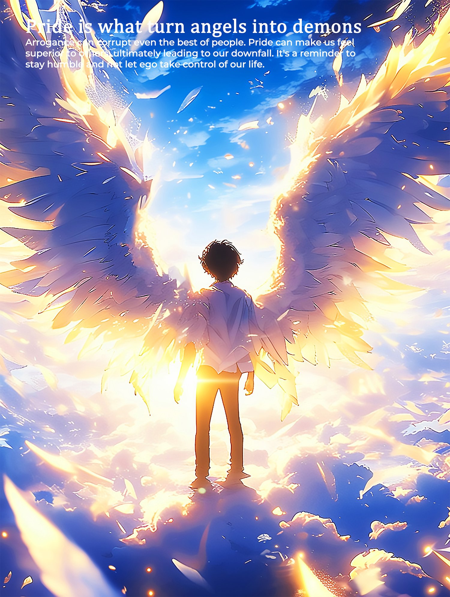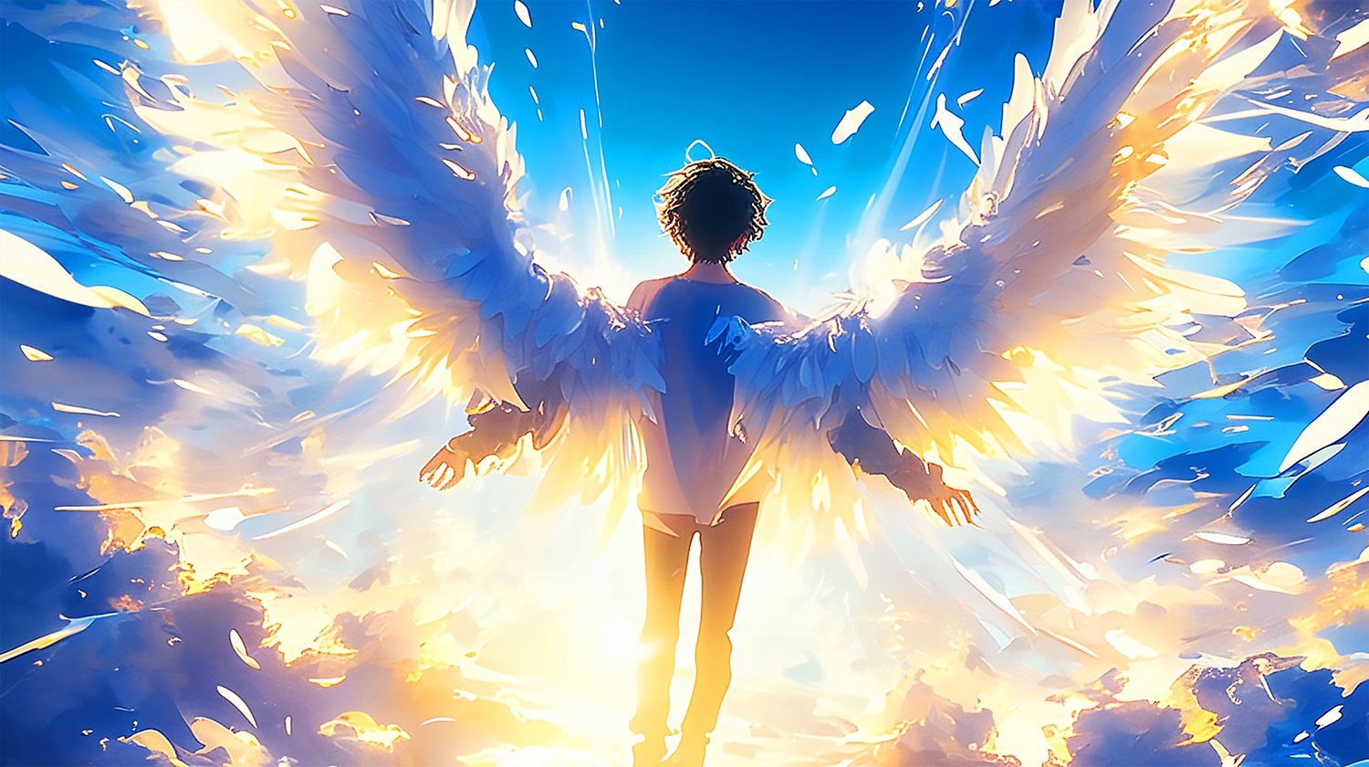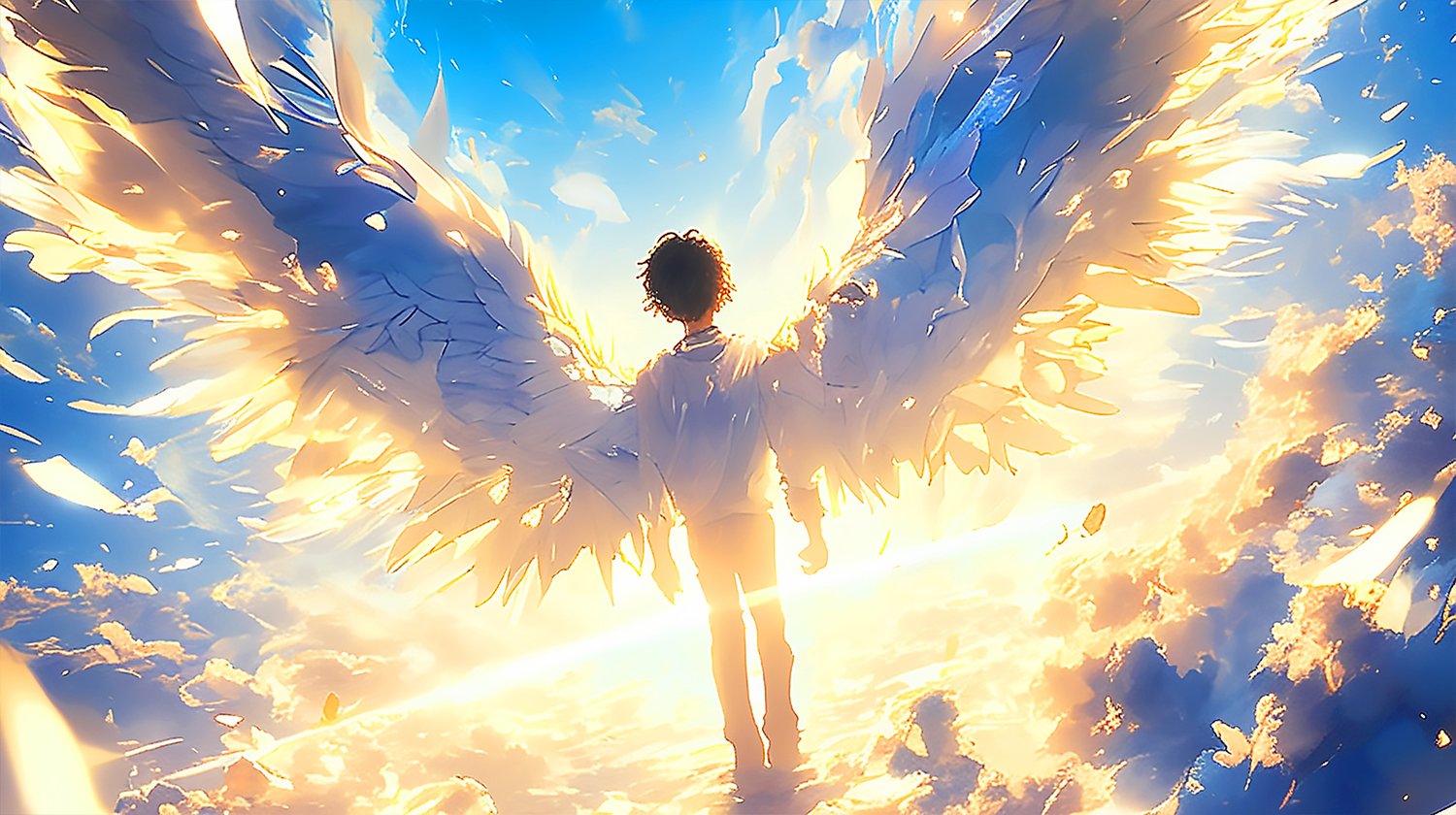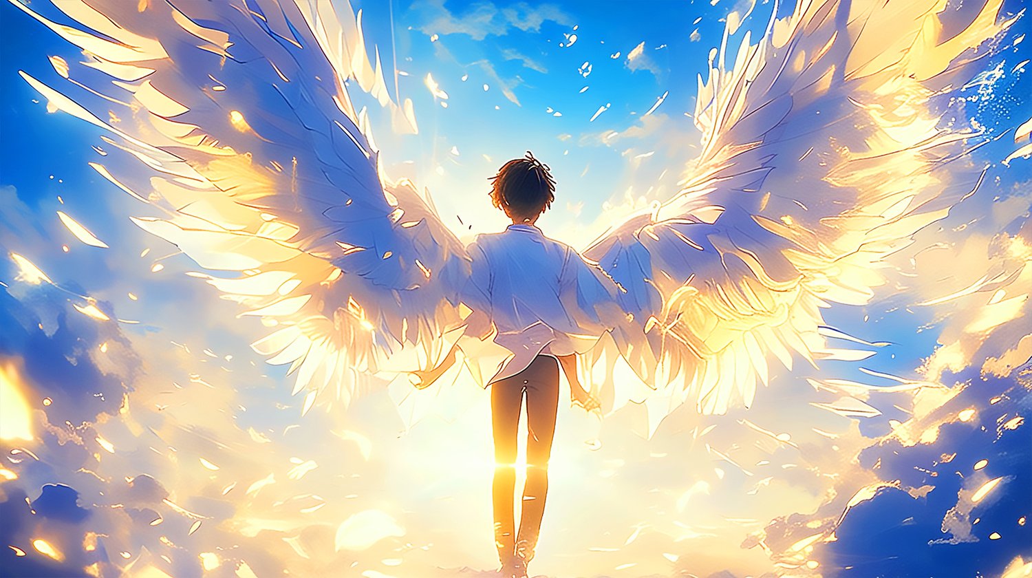 Ethereal Winged Boy - Anime Art: Dive into a world of wonder with this stunning digital artwork featuring an anime-style young boy with luminous angel wings, standing amidst a vibrant sky of floating feathers and golden light. Perfect for fans of fantasy and angelic themes, this high-resolution image captures the essence of hope, strength, and purity. Ideal for prints, digital wallpapers, or collectibles.Â