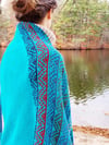 Large Shawl (blue) shown in one ten-skein set of Wollmeisen Birdies Pure in colorway Bärchen and two skeins of Pure in colorway All Inclusive