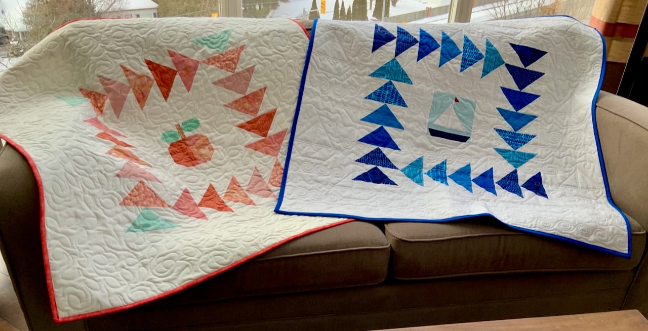 Just Peachy and Sail Away - Side by side offer different designs in the same pattern . Use the paper pieced templates for the peach or sail boat for the centre motif or try one of the classic blocks illustrated in the pattern. Fussy cut a favourite fabric and coordinate with the Flying geese colours. Make it yours to remember.