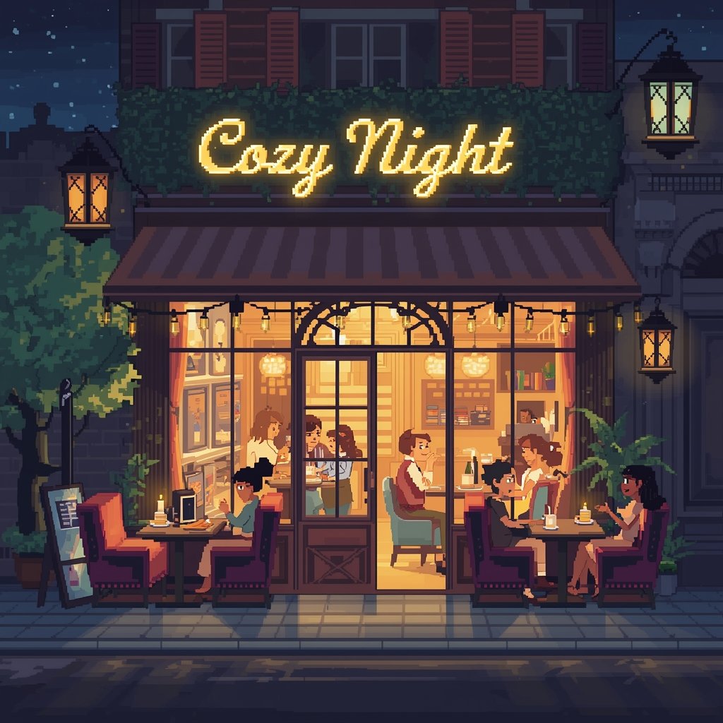 A detailed pixel‑art illustration of a cozy night café featuring warm lighting, relaxed characters, and a charming retro evening atmosphere.