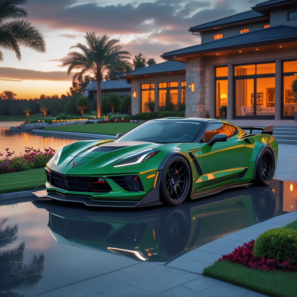 A stunning Chevrolet Corvette ZR1 Verde GB23, fully Mansory customized body kit with aggressive widebody design, sharp aerodynamic lines, carbon fiber front splitter, side skirts and rear diffuser, large rear wing, matte black mags wheels with low-profile performance tires — parked in the driveway of a modern luxury family lake house. The house features floor-to-ceiling glass windows, natural stone and wood finishes, warm ambient interior lighting glowing from inside. Beautiful garden landscaping surrounds the driveway — manicured lawns, sculpted hedges, colorful flower beds, palm trees, and soft pathway lights. A calm lake reflects the golden sunset in the background. Ultra-realistic, 8K resolution, cinematic lighting, HDR, shallow depth of field, professional automotive photography, dramatic sky, reflections on glossy paint, highly detailed textures, luxury lifestyle atmosphere.