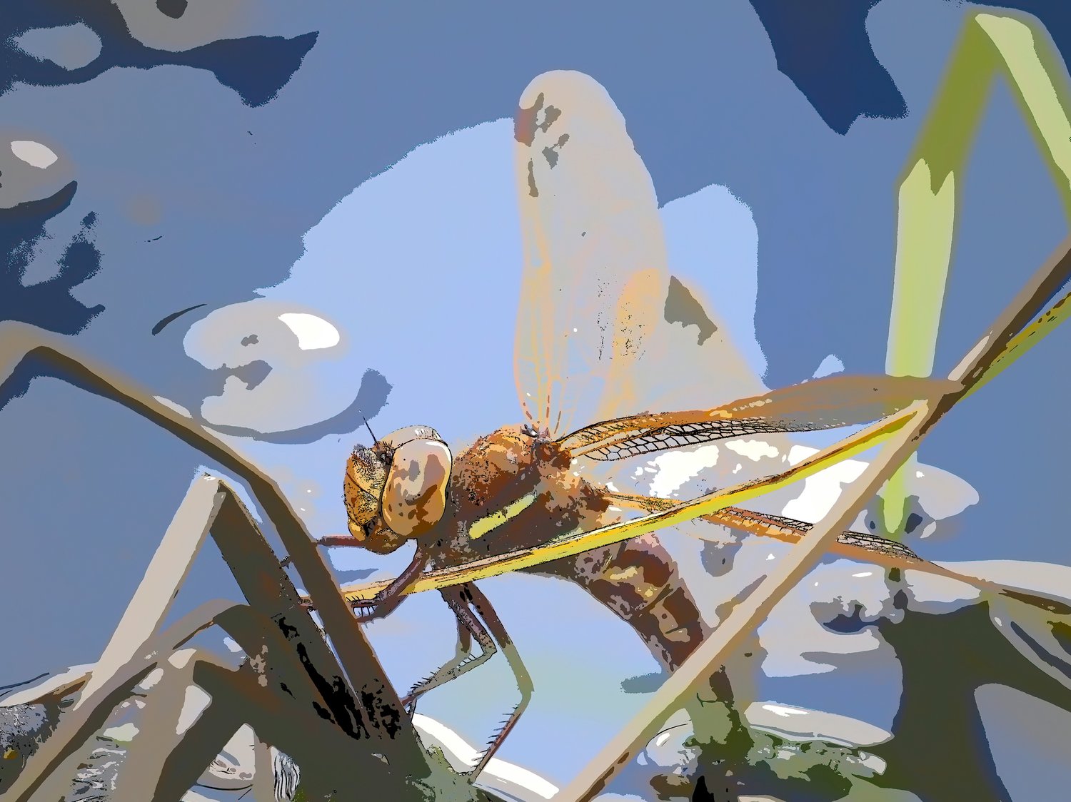 A dragonfly lays eggs in water. Art photograph. Digital drawing. like a painting.