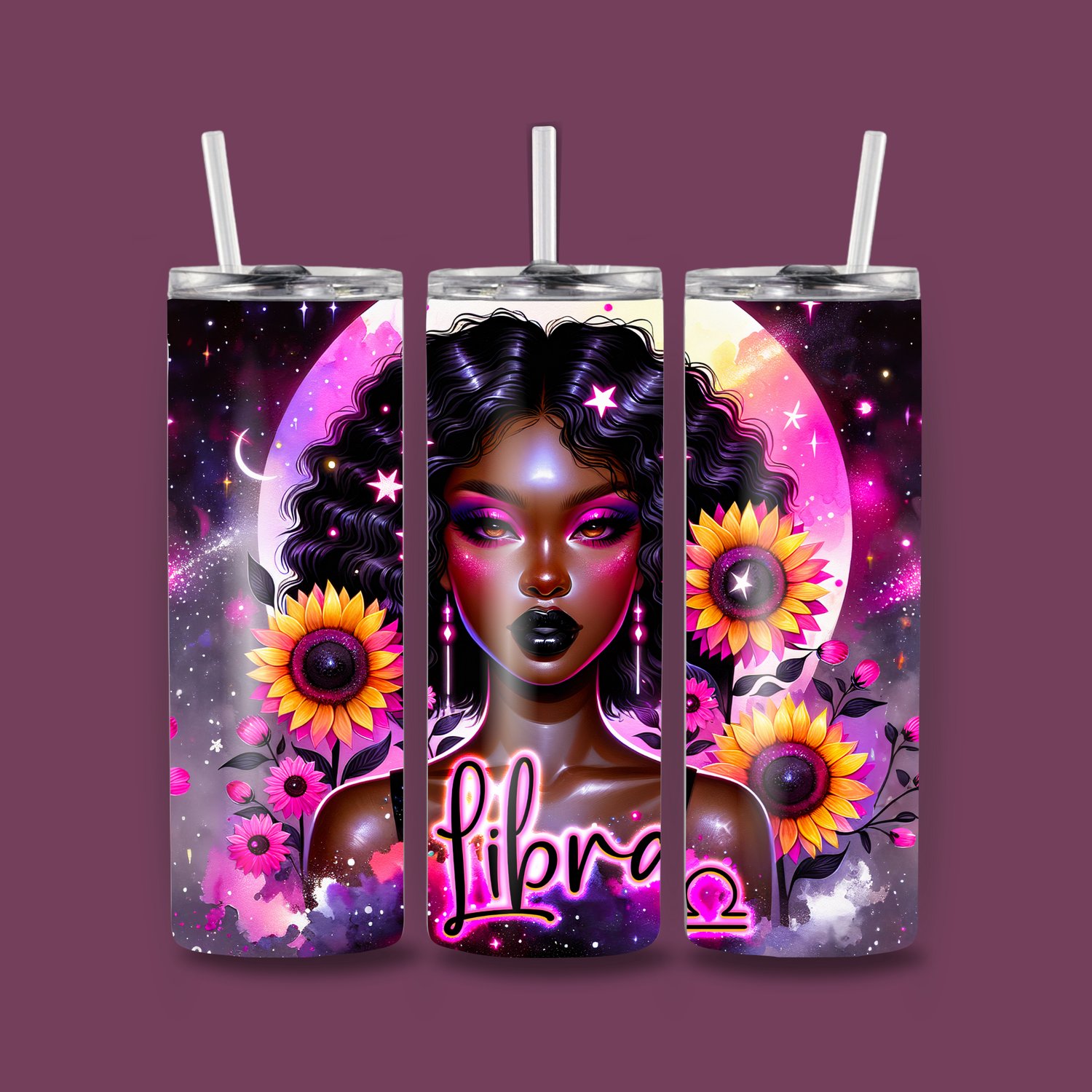 Featuring a stunning cosmic goddess with glowing moonlight, vibrant sunflowers, and dreamy pink + purple galaxy tones, this Libra Zodiac 20oz Skinny Tumbler reflects your love for harmony, elegance, and all things aesthetically pleasing.