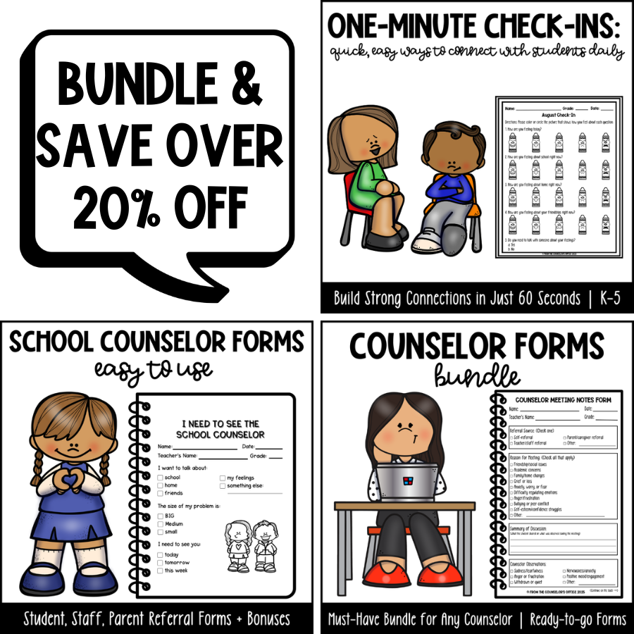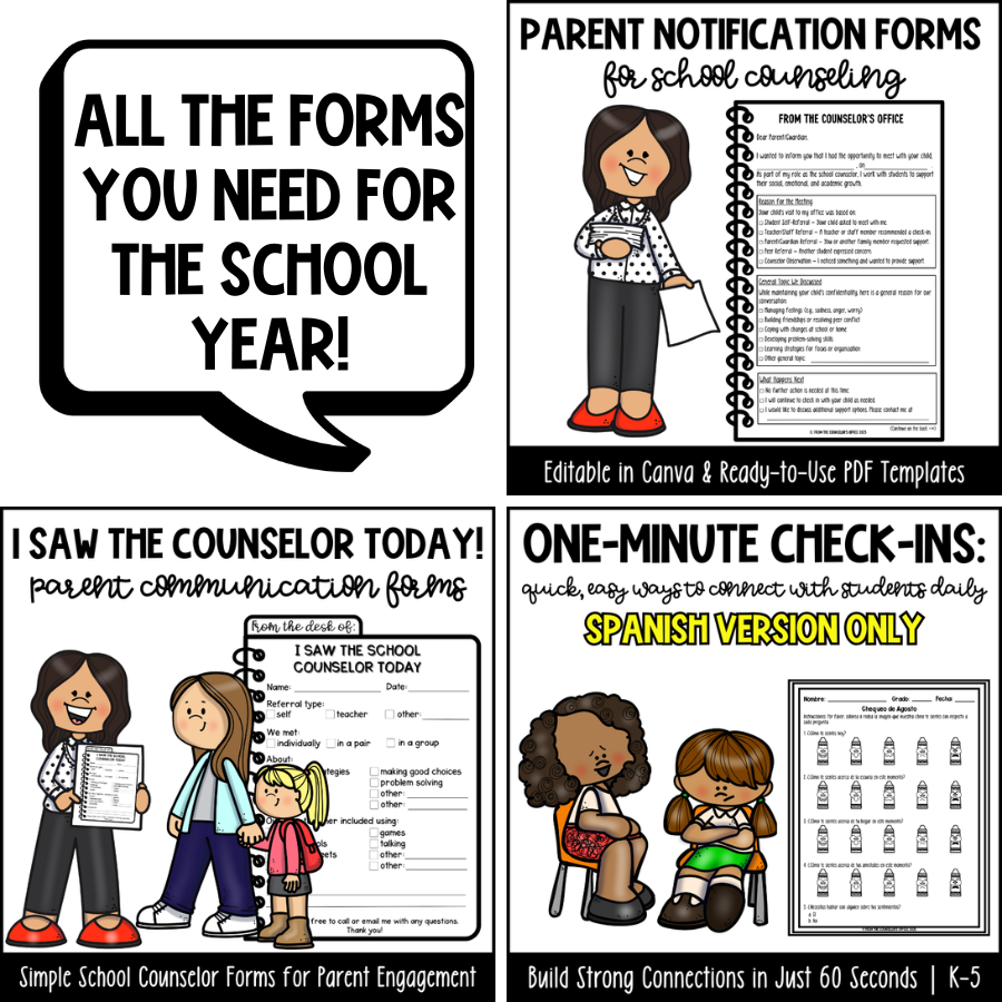 - School Counselor Referral Forms (K-5): Printable, editable forms for self-referrals, staff, and parent referrals, plus a bonus check-in form.