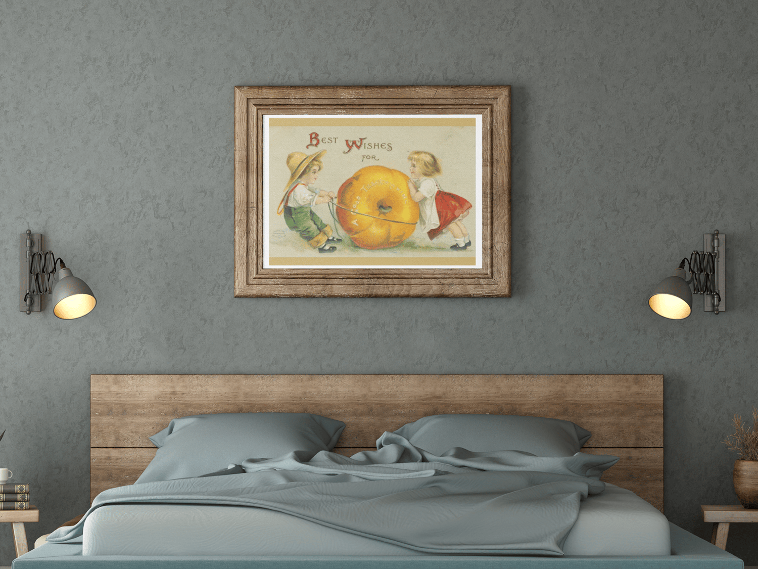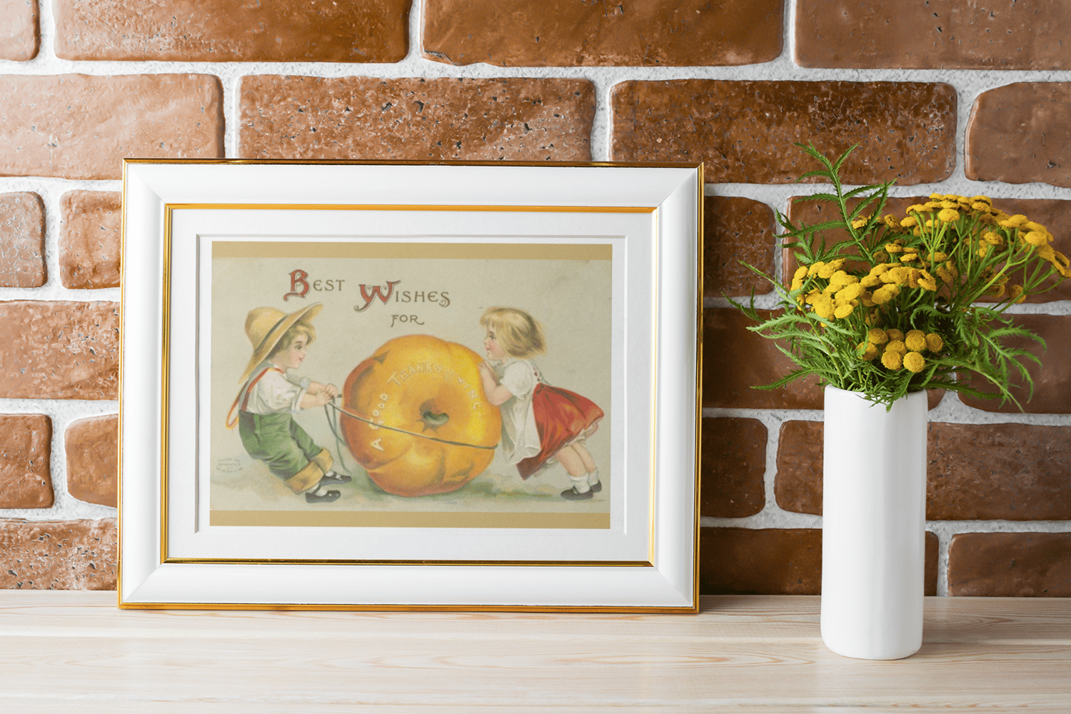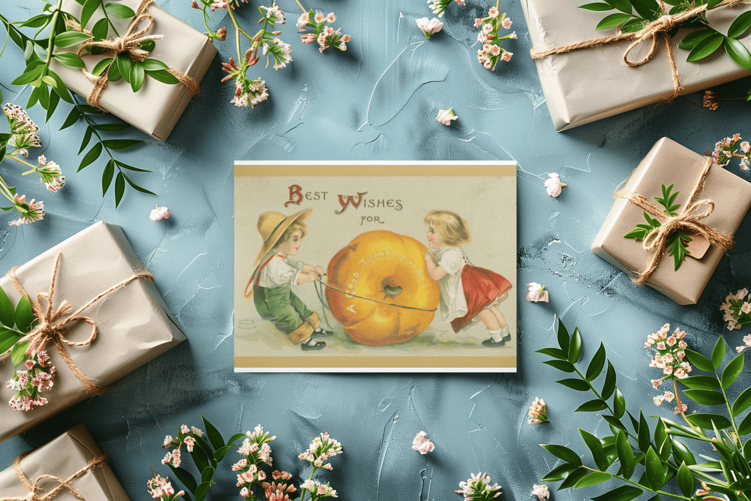 Celebrate Thanksgiving with a touch of vintage charm! This nostalgic postcard design features a delightful illustration of two children with a giant pumpkin, expressing warm wishes for a joyful Thanksgiving. Perfect for creating holiday memories, this high-resolution digital postcard is ideal for scrapbooking, altered art, gift tags, gift bags, magnets, framed prints, small posters, stickers, labels, and more.
